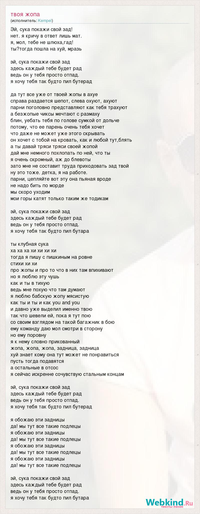 Эй, сука покажи свой зад! нет. я кричу в ответ лишь мат. я, мол, тебе не шлюха,гад! ты?тогда пошла на хуй, мразь эй, сука покажи свой зад здесь каждый тебе будет рад ведь он у тебя просто отпад. я хочу тебя так будто пил бутерад да тут все уже от твоей жопы в ахуе справа раздается шепот, слева охуют, ахуют парни поголовно представляют как тебя трахуют а безжопые чиксы мечтают с размаху блин, уебать тебя по голове сумкой от дольче потому, что ее парень очень тебя хочет что даже не может уже этого скрывать он хочет с тобой на кровать, как и любой тут,блять а ты давай тряси тряси своей жопой дай мне немного похлопать по ней, что ты я очень скромный, аж до блевоты зато мне не составит труда приходовать зад твой ну это тоже. детка, я на работе. парни, цепляйте вот эту она пьяная вроде не надо бить по морде мы скоро уходим мои горы катят только таким же тодикам эй, сука покажи свой зад здесь каждый тебе будет рад ведь он у тебя просто отпад. я хочу тебя так будто пил бутара ты клубная сука ха ха ха хи хи хи хи тогда я пишу с пишкиным на ровне стихи хи хи про жопы и про то что в них там впихивают но я люблю эту чушь как и ты в тихую ведь мне похую что там думают я люблю бабскую жопу мясистую как ты и ты и как you and you и давно уже выделил именно твою так что шевели ей, пока я тут пою со своим взглядом на такой багажник в бою ему команду даю мол смотри в сторону но ему поровну я к нему словно прикованный жопа, жопа, жопа, задница, задница хуй знает кому она тут может не понравиться пусть тогда подавятся а остальные в отсос я сейчас искренне сочувствую стальным концам эй, сука покажи свой зад здесь каждый тебе будет рад ведь он у тебя просто отпад. я хочу тебя так будто пил бутерад я обожаю эти задницы да! мы тут все такие подлецы я обожаю эти задницы да! мы тут все такие подлецы я обожаю эти задницы да! мы тут все такие подлецы я обожаю эти задницы да! мы тут все такие подлецы эй, сука покажи свой зад здесь каждый тебе будет рад ведь он у тебя просто отпад. я хочу тебя так будто пил бутара