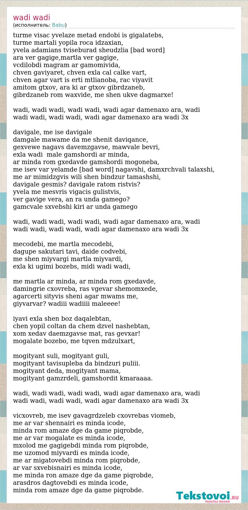 turme visac yvelaze metad endobi is gigalatebs, turme martali yopila roca idzaxian, yvela adamians tviseburad sheudzlia [bad word] ara ver gagige,martla ver gagige, vcdilobdi magram ar gamomivida, chven gaviyaret, chven exla cal calke vart, chven agar vart is erti mtlianoba, rac viyavit amitom gtxov, ara ki ar gtxov gibrdzaneb, gibrdzaneb rom waxvide, me shen ukve dagmarxe! wadi, wadi wadi, wadi wadi, wadi agar damenaxo ara, wadi wadi wadi, wadi wadi, wadi agar damenaxo ara wadi 3x davigale, me ise davigale damgale mawame da me shenit daviqance, gexvewe nagavs davemzgavse, mawvale bevri, exla wadi male gamshordi ar minda, ar minda rom gxedavde gamshordi mogoneba, me isev var yelamde [bad word] nagavshi, damxrchvali talaxshi, me ar mimidzgvis wili shen bindzur tamashshi, davigale gesmis? davigale ratom ristvis? yvela me mesvris vigacis gulistvis, ver gavige vera, an ra unda gamego? gamcvale sxvebshi kiri ar unda gamego wadi, wadi wadi, wadi wadi, wadi agar damenaxo ara, wadi wadi wadi, wadi wadi, wadi agar damenaxo ara wadi 3x mecodebi, me martla mecodebi, dagupe sakutari tavi, daide codvebi, me shen miyvargi martla miyvardi, exla ki ugimi bozebs, midi wadi wadi, me martla ar minda, ar minda rom gxedavde, damingrie cxovreba, ras vgevar shemomxede, agarcerti sityvis sheni agar mwams me, giyvarvar? wadiii wadiiii maleeee! iyavi exla shen boz daqalebtan, chen yopil coltan da chem dzvel nashebtan, xom xedav daemzgavse mat, ras gevxar! mogalate bozebo, me tqven mdzulxart, mogityant suli, mogityant guli, mogityant tavisupleba da bindzuri puliii. mogityant deda, mogityant mama, mogityant gamzrdeli, gamshordit kmaraaaa. wadi, wadi wadi, wadi wadi, wadi agar damenaxo ara, wadi wadi wadi, wadi wadi, wadi agar damenaxo ara wadi 3x vicxovreb, me isev gavagrdzeleb cxovrebas viomeb, me ar var shennairi es minda icode, minda rom amaze dge da game piqrobde, me ar var mogalate es minda icode, mxolod me gagigebdi minda rom piqrobde, me uzomod miyvardi es minda icode, me ar migatovebdi minda rom piqrobde, ar var sxvebisnairi es minda icode, me minda ron amaze dge da game piqrobde, arasdros dagtovebdi es minda icode, minda rom amaze dge da game piqrobde.