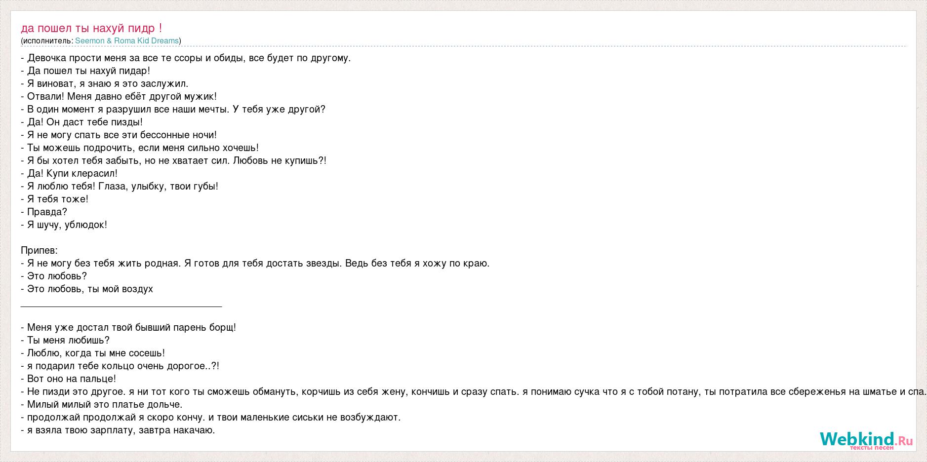 - Девочка прости меня за все те ссоры и обиды, все будет по другому. - Да пошел ты нахуй пидар! - Я виноват, я знаю я это заслужил. - Отвали! Меня давно ебёт другой мужик! - В один момент я разрушил все наши мечты. У тебя уже другой? - Да! Он даст тебе пизды! - Я не могу спать все эти бессонные ночи! - Ты можешь подрочить, если меня сильно хочешь! - Я бы хотел тебя забыть, но не хватает сил. Любовь не купишь?! - Да! Купи клерасил! - Я люблю тебя! Глаза, улыбку, твои губы! - Я тебя тоже! - Правда? - Я шучу, ублюдок! Припев: - Я не могу без тебя жить родная. Я готов для тебя достать звезды. Ведь без тебя я хожу по краю. - Это любовь? - Это любовь, ты мой воздух _____________________________________ - Меня уже достал твой бывший парень борщ! - Ты меня любишь? - Люблю, когда ты мне сосешь! - я подарил тебе кольцо очень дорогое..?! - Вот оно на пальце! - Не пизди это другое. я ни тот кого ты сможешь обмануть, корчишь из себя жену, кончишь и сразу спать. я понимаю сучка что я с тобой потану, ты потратила все сбереженья на шматье и спа. - Милый милый это платье дольче. - продолжай продолжай я скоро кончу. и твои маленькие сиськи не возбуждают. - я взяла твою зарплату, завтра накачаю.