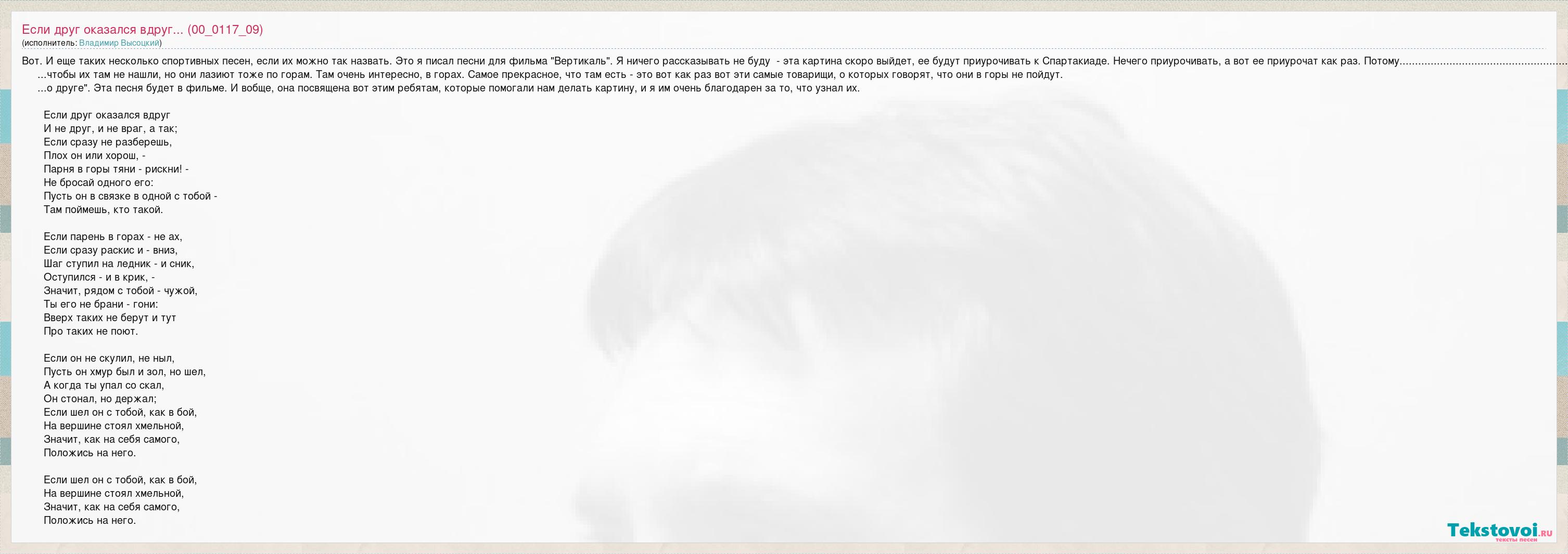 А как ты думаешь, о чем песня "Если друг оказался вдруг... (00_0117_09)" ?