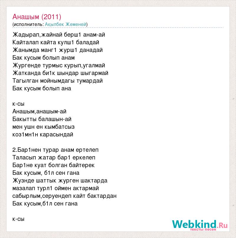 Жадырап,жайнай берш1 анам-ай Кайталап кайта кулш1 баладай Жанымда манг1 журш1 данадай Бак кусым болып анам Жургенде турмыс курып,угалмай Жатканда би1к шындар шыгармай Тагылган мойнымдагы тумардай Бак кусым болып ана к-сы Анашым,анашым-ай Бакытты балашын-ай мен ушн ен кымбатсыз коз1мн1н карасындай 2.Бар1нен турар анам ертелеп Таласып жатар бар1 еркелеп Бар1не куат болган байтерек Бак кусым, б1л сен гана Жузнде шаттык журген шактарда мазалап турл1 оймен актармай сабырлым,серуендеп кайт бактардан Бак кусым,б1л сен гана к-сы