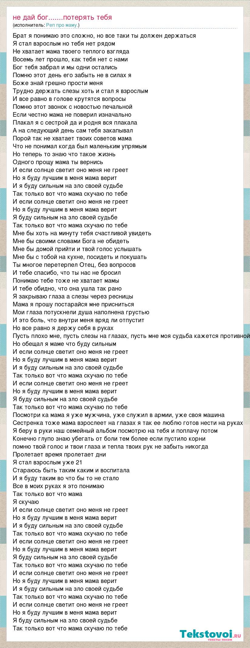 Брат я понимаю это сложно, но все таки ты должен держаться Я стал взрослым но тебя нет рядом Не хватает мама твоего теплого взгляда Восемь лет прошло, как тебя нет с нами Бог тебя забрал и мы одни остались Помню этот день его забыть не в силах я Боже знай грешно прости меня Трудно держать слезы хоть и стал я взрослым И все равно в голове крутятся вопросы Помню этот звонок с новостью печальной Если честно мама не поверил изначально Плакал я с сестрой да и родня вся плакала А на следующий день сам тебя закапывал Порой так не хватает твоих советов мама Что не понимал когда был маленьким упрямым Но теперь то знаю что такое жизнь Одного прощу мама ты вернись И если солнце светит оно меня не греет Но я буду лучшим в меня мама верит И я буду сильным на зло своей судьбе Так только вот что мама скучаю по тебе И если солнце светит оно меня не греет Но я буду лучшим в меня мама верит Я буду сильным на зло своей судьбе Так только вот что мама скучаю по тебе Мне бы хоть на минуту тебя счастливой увидеть Мне бы своими словами Бога не обидеть Мне бы домой прийти и твой голос услышать Мне бы с тобой на кухне, посидеть и покушать Ты многое перетерпел Отец, без вопросов И тебе спасибо, что ты нас не бросил Понимаю тебе тоже не хватает мамы И тебе обидно, что она ушла так рано Я закрываю глаза а слезы через ресницы Мама я прошу постарайся мне присниться Мои глаза потускнели душа наполнена грустью И это боль, что внутри меня вряд ли отпустит Но все равно я держу себя в руках Пусть плохо мне, пусть слезы на глазах, пусть мне моя судьба кажется противной Но обещал я маме что буду сильным И если солнце светит оно меня не греет Но я буду лучшим в меня мама верит И я буду сильным на зло своей судьбе Так только вот что мама скучаю по тебе И если солнце светит оно меня не греет Но я буду лучшим в меня мама верит Я буду сильным на зло своей судьбе Так только вот что мама скучаю по тебе Посмотри ка мама я уже мужчина, уже служил в армии, уже своя машина Сестренка тоже мама взрослеет на глазах я так ее люблю готов нести на руках Я беру в руки наш семейный альбом посмотрю на тебя и поплачу потом Конечно глупо знаю убегать от боли тем более если пустило корни помню твой голос и твои глаза и тепла твоих рук не забыть никогда Пролетает время пролетает дни Я стал взрослым уже 21 Стараюсь быть таким каким и воспитала И я буду таким во что бы то не стало Все в моих руках я это понимаю Так только вот что мама Я скучаю И если солнце светит оно меня не греет Но я буду лучшим в меня мама верит И я буду сильным на зло своей судьбе Так только вот что мама скучаю по тебе И если солнце светит оно меня не греет Но я буду лучшим в меня мама верит Я буду сильным на зло своей судьбе Так только вот что мама скучаю по тебе И если солнце светит оно меня не греет Но я буду лучшим в меня мама верит И я буду сильным на зло своей судьбе Так только вот что мама скучаю по тебе И если солнце светит оно меня не греет Но я буду лучшим в меня мама верит Я буду сильным на зло своей судьбе Так только вот что мама скучаю по тебе