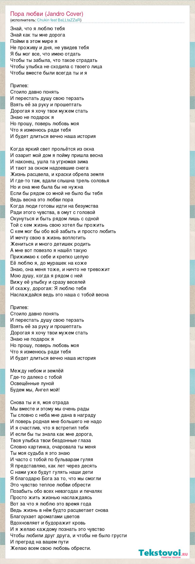 Знай, что я люблю тебя Знай как ты мне дорога Пойми в этом мире я Не проживу и дня, не увидев тебя Я бы мог все, что имею отдать Чтобы ты забыла, что такое страдать Чтобы улыбка не сходила с твоего лица Чтобы вместе были всегда ты и я Припев: Стоило давно понять И перестать душу свою терзать Взять её за руку и прошептать Дорогая я хочу твои мужем стать Знаю не подарок я Но прошу, поверь любовь моя Что я изменюсь ради тебя И будет длиться вечно наша история Когда яркий свет прольётся из окна И озарит мой дом я пойму пришла весна И наконец, ушла та угрюмая зима И тают за окном надоевшие снега Жизнь расцвела, и краски обрела земля И где-то там, вдали слышна трель соловья Но и она мне была бы не нужна Если бы рядом со мной не было бы тебя Ведь весна это любви пора Когда люди готовы идти на безумства Ради этого чувства, в омут с головой Окунуться и быть рядом лишь с одной Той с кем жизнь свою хотел бы прожить С кем мог бы обо всё забыть и просто любить И мечту свою в жизнь воплотить Жениться и много детишек родить А мне вот повезло я нашёл такую Прижимаю к себе и крепко целую Её люблю я, до мурашек на коже Знаю, она меня тоже, и ничто не тревожит Мою душу, когда я рядом с ней Вижу её улыбку и сразу веселей И скажу, дорогая: Я люблю тебя Наслаждайся ведь это наша с тобой весна Припев: Стоило давно понять И перестать душу свою терзать Взять её за руку и прошептать Дорогая я хочу твои мужем стать Знаю не подарок я Но прошу, поверь любовь моя Что я изменюсь ради тебя И будет длиться вечно наша история Между небом и землёй Где-то далеко с тобой Освещённые луной Будем мы, Ангел мой! Снова ты и я, моя отрада Мы вместе и этому мы очень рады Ты словно с неба мне дана в награду И поверь родная мне большего не надо И я счастлив, что я встретил тебя И если бы ты знала как мне дорога, Твоя улыбка твои бездонные глаза Словно картинка, очаровала ты меня Ты моя судьба я это знаю И часто с тобой по бульварам гуляя Я представляю, как лет через десять С нами уже будут гулять наши дети Я благодарю Бога за то, что мы смогли Это чувство теплое любви обрести Позабыть обо всех невзгодах и печалях Просто жить жизнью наслаждаясь Вот за что я люблю это время года Ведь жизнь в нём будто расцветает снова Благоухает ароматами цветов Вдохновляет и будоражит кровь И я желаю каждому познать это чувство Чтобы любили друг друга, и чтобы не было грусти И преград на вашем пути Желаю всем свою любовь обрести.
