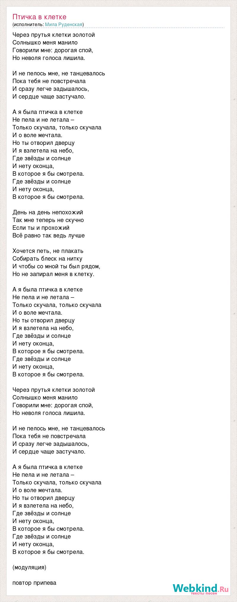 Через прутья клетки золотой Солнышко меня манило Говорили мне: дорогая спой, Но неволя голоса лишила. И не пелось мне, не танцевалось Пока тебя не повстречала И сразу легче задышалось, И сердце чаще застучало. А я была птичка в клетке Не пела и не летала – Только скучала, только скучала И о воле мечтала. Но ты отворил дверцу И я взлетела на небо, Где звёзды и солнце И нету оконца, В которое я бы смотрела. Где звёзды и солнце И нету оконца, В которое я бы смотрела. День на день непохожий Так мне теперь не скучно Если ты и прохожий Всё равно так ведь лучше Хочется петь, не плакать Собирать блеск на нитку И чтобы со мной ты был рядом, Но не запирал меня в клетку. А я была птичка в клетке Не пела и не летала – Только скучала, только скучала И о воле мечтала. Но ты отворил дверцу И я взлетела на небо, Где звёзды и солнце И нету оконца, В которое я бы смотрела. Где звёзды и солнце И нету оконца, В которое я бы смотрела. Через прутья клетки золотой Солнышко меня манило Говорили мне: дорогая спой, Но неволя голоса лишила. И не пелось мне, не танцевалось Пока тебя не повстречала И сразу легче задышалось, И сердце чаще застучало. А я была птичка в клетке Не пела и не летала – Только скучала, только скучала И о воле мечтала. Но ты отворил дверцу И я взлетела на небо, Где звёзды и солнце И нету оконца, В которое я бы смотрела. Где звёзды и солнце И нету оконца, В которое я бы смотрела. (модуляция) повтор припева