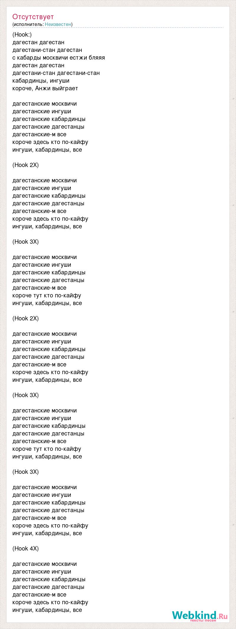 (Hook:) дагестан дагестан дагестани-стан дагестан с кабарды москвичи естжи бляяя дагестан дагестан дагестани-стан дагестани-стан кабардинцы, ингуши короче, Анжи выйграет дагестанские москвичи дагестанские ингуши дагестанские кабардинцы дагестанские дагестанцы дагестанские-м все короче здесь кто по-кайфу ингуши, кабардинцы, все (Hook 2Х) дагестанские москвичи дагестанские ингуши дагестанские кабардинцы дагестанские дагестанцы дагестанские-м все короче здесь кто по-кайфу ингуши, кабардинцы, все (Hook 3Х) дагестанские москвичи дагестанские ингуши дагестанские кабардинцы дагестанские дагестанцы дагестанские-м все короче тут кто по-кайфу ингуши, кабардинцы, все (Hook 2Х) дагестанские москвичи дагестанские ингуши дагестанские кабардинцы дагестанские дагестанцы дагестанские-м все короче здесь кто по-кайфу ингуши, кабардинцы, все (Hook 3Х) дагестанские москвичи дагестанские ингуши дагестанские кабардинцы дагестанские дагестанцы дагестанские-м все короче тут кто по-кайфу ингуши, кабардинцы, все (Hook 3Х) дагестанские москвичи дагестанские ингуши дагестанские кабардинцы дагестанские дагестанцы дагестанские-м все короче здесь кто по-кайфу ингуши, кабардинцы, все (Hook 4Х) дагестанские москвичи дагестанские ингуши дагестанские кабардинцы дагестанские дагестанцы дагестанские-м все короче здесь кто по-кайфу ингуши, кабардинцы, все