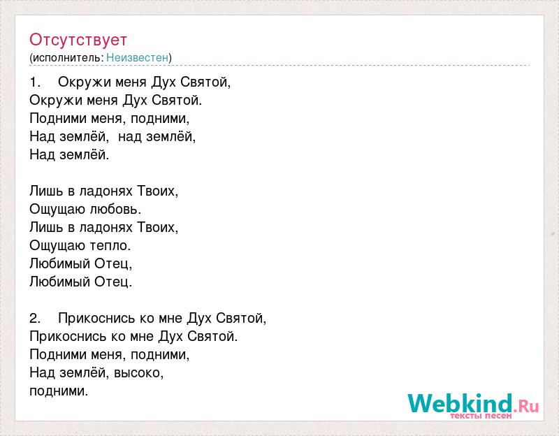 1. Окружи меня Дух Святой, Окружи меня Дух Святой. Подними меня, подними, Над землёй, над землёй, Над землёй. Лишь в ладонях Твоих, Ощущаю любовь. Лишь в ладонях Твоих, Ощущаю тепло. Любимый Отец, Любимый Отец. 2. Прикоснись ко мне Дух Святой, Прикоснись ко мне Дух Святой. Подними меня, подними, Над землёй, высоко, подними.