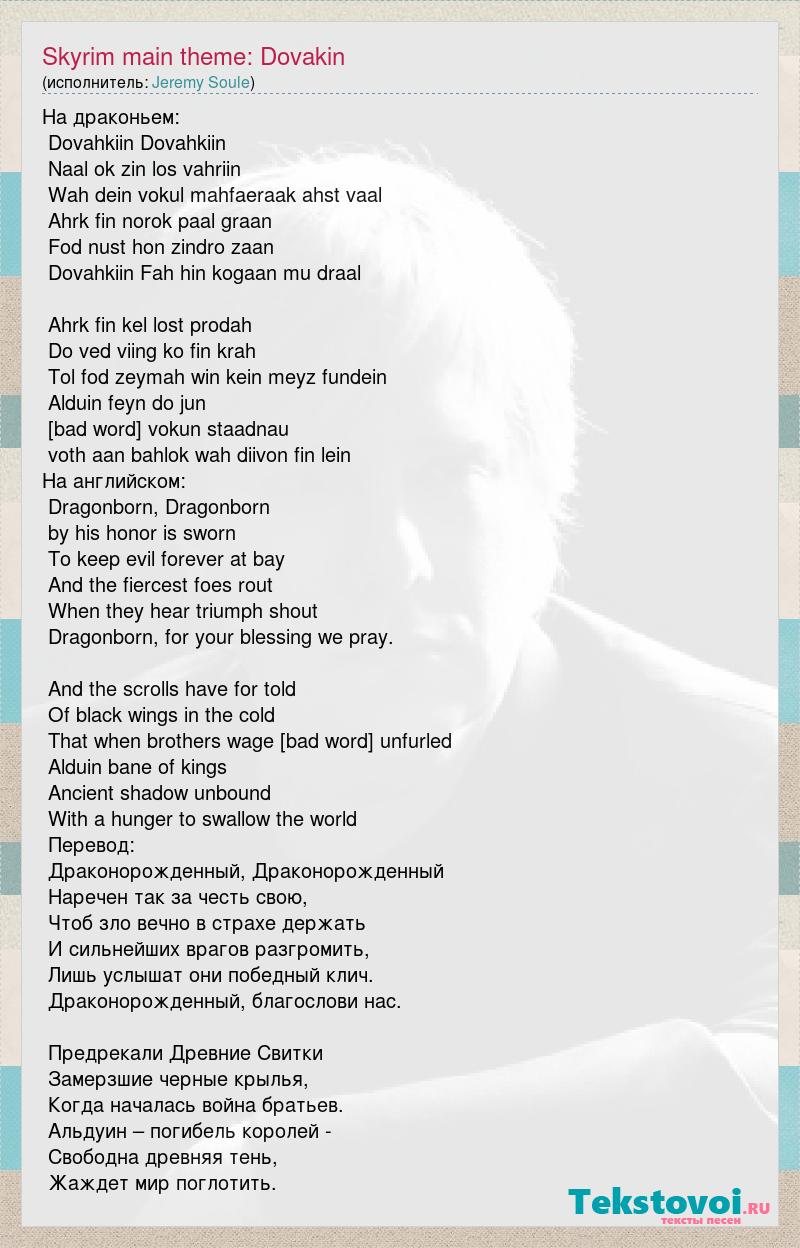 На драконьем: Dovahkiin Dovahkiin Naal ok zin los vahriin Wah dein vokul mahfaeraak ahst vaal Ahrk fin norok paal graan Fod nust hon zindro zaan Dovahkiin Fah hin kogaan mu draal Ahrk fin kel lost prodah Do ved viing ko fin krah Tol fod zeymah win kein meyz fundein Alduin feyn do jun kruziik vokun staadnau voth aan bahlok wah diivon fin lein На английском: Dragonborn, Dragonborn by his honor is sworn To keep evil forever at bay And the fiercest foes rout When they hear triumph shout Dragonborn, for your blessing we pray. And the scrolls have for told Of black wings in the cold That when brothers wage war come unfurled Alduin bane of kings Ancient shadow unbound With a hunger to swallow the world Перевод: Драконорожденный, Драконорожденный Наречен так за честь свою, Чтоб зло вечно в страхе держать И сильнейших врагов разгромить, Лишь услышат они победный клич. Драконорожденный, благослови нас. Предрекали Древние Свитки Замерзшие черные крылья, Когда началась война братьев. Альдуин – погибель королей - Свободна древняя тень, Жаждет мир поглотить.