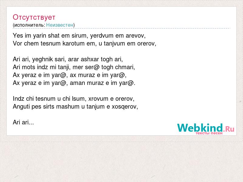 Yes im yarin shat em sirum, yerdvum em arevov, Vor chem tesnum karotum em, u tanjvum em orerov, Ari ari, yeghnik sari, arar ashxar togh ari, Ari mots indz mi tanji, mer ser@ togh chmari, Ax yeraz e im yar@, ax muraz e im yar@, Ax yeraz e im yar@, aman muraz e im yar@. Indz chi tesnum u chi lsum, xrovum e orerov, Anguti pes sirts mashum u tanjum e xosqerov, Ari ari...