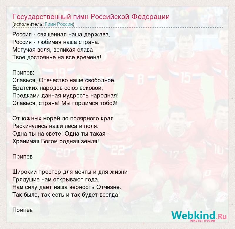 Россия - священная наша держава, Россия - любимая наша страна. Могучая воля, великая слава - Твое достоянье на все времена! Припев: Славься, Отечество наше свободное, Братских народов союз вековой, Предками данная мудрость народная! Славься, страна! Мы гордимся тобой! От южных морей до полярного края Раскинулись наши леса и поля. Одна ты на свете! Одна ты такая - Хранимая Богом родная земля! Припев Широкий простор для мечты и для жизни Грядущие нам открывают года. Нам силу дает наша верность Отчизне. Так было, так есть и так будет всегда! Припев