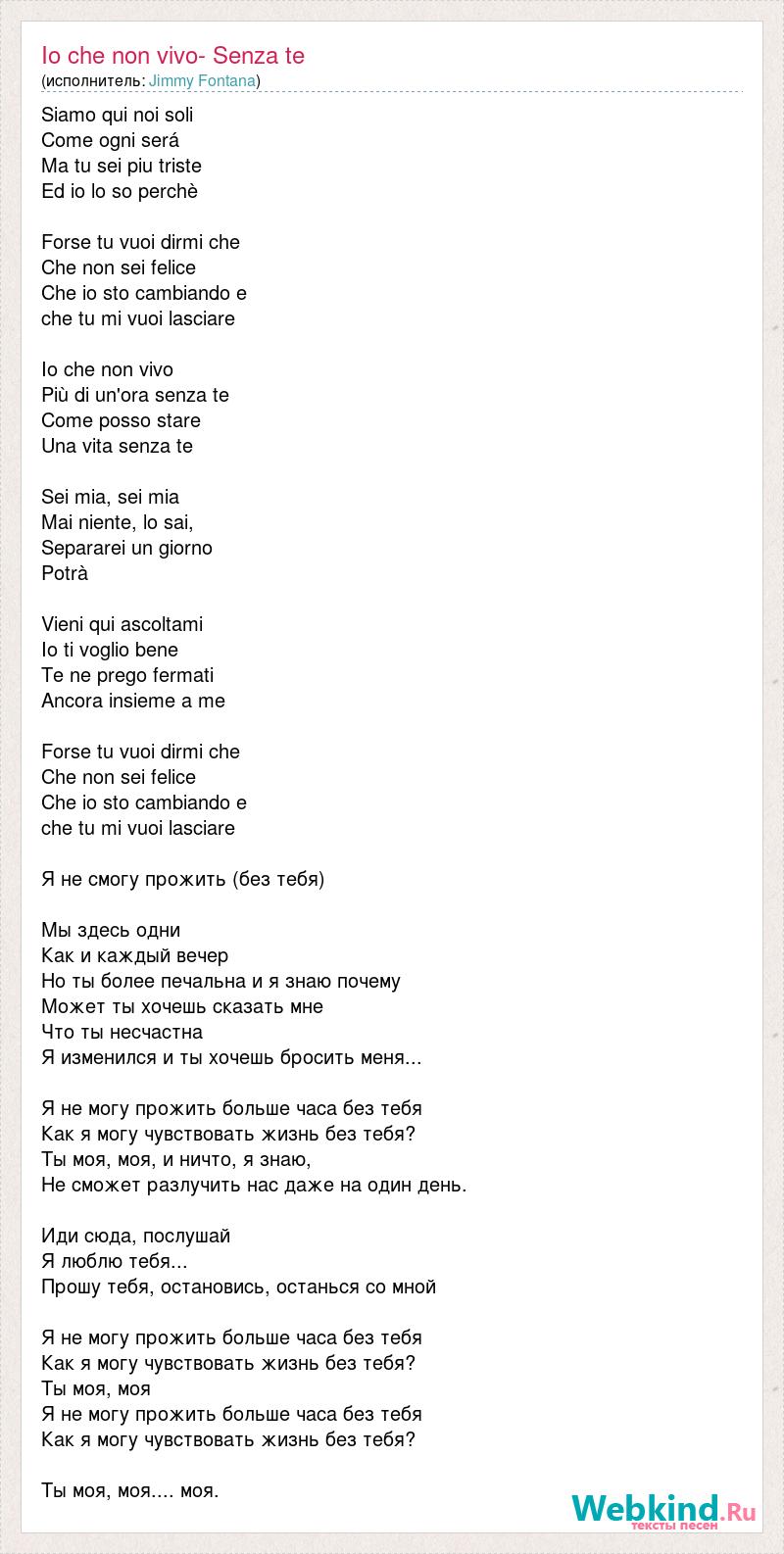 Siamo qui noi soli Come ogni será Ma tu sei piu triste Ed io lo so perchè Forse tu vuoi dirmi che Che non sei felice Che io sto cambiando e che tu mi vuoi lasciare Io che non vivo Più di un'ora senza te Come posso stare Una vita senza te Sei mia, sei mia Mai niente, lo sai, Separarei un giorno Potrà Vieni qui ascoltami Io ti voglio bene Te ne prego fermati Ancora insieme a me Forse tu vuoi dirmi che Che non sei felice Che io sto cambiando e che tu mi vuoi lasciare Я не смогу прожить (без тебя) Мы здесь одни Как и каждый вечер Но ты более печальна и я знаю почему Может ты хочешь сказать мне Что ты несчастна Я изменился и ты хочешь бросить меня... Я не могу прожить больше часа без тебя Как я могу чувствовать жизнь без тебя? Ты моя, моя, и ничто, я знаю, Не сможет разлучить нас даже на один день. Иди сюда, послушай Я люблю тебя... Прошу тебя, остановись, останься со мной Я не могу прожить больше часа без тебя Как я могу чувствовать жизнь без тебя? Ты моя, моя Я не могу прожить больше часа без тебя Как я могу чувствовать жизнь без тебя? Ты моя, моя.... моя.