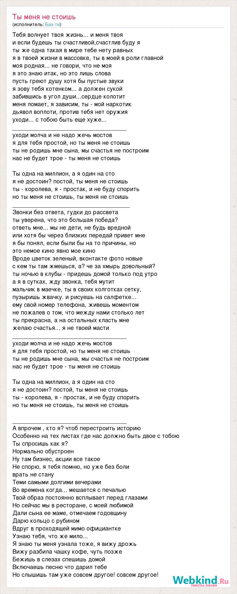 Тебя волнует твоя жизнь... и меня твоя и если будешь ты счастливой,счастлив буду я ты же одна такая в мире тебе нету равных я в твоей жизни в массовке, ты в моей в роли главной моя родная... не говори, что не моя я это знаю итак, но это лишь слова пусть греют душу хотя бы пустые звуки я зову тебя котенком... а должен сукой забившись в угол души...сердце колотит меня ломает, я зависим, ты - мой наркотик дьявол воплоти, против тебя нет оружия уходи... с тобою быть еще хуже... ___________________________________ уходи молча и не надо жечь мостов я для тебя простой, но ты меня не стоишь ты не родишь мне сына, мы счастья не построим нас не будет трое - ты меня не стоишь Ты одна на миллион, а я один на сто я не достоин? постой, ты меня не стоишь ты - королева, я - простак, и не буду спорить но ты меня не стоишь, ты меня не стоишь ____________________________________ Звонки без ответа, гудки до рассвета ты уверена, что это большая победа? ответь мне... мы не дети, не будь вредной или хотя бы через близких передай привет мне я бы понял, если были бы на то причины, но это немое кино явно мое кино Вроде цветок зеленый, вконтакте фото новые с кем ты там жмешься, а? че за хмырь довольный? ты ночью в клубы - придешь домой только под утро а я в сутках, жду звонка, тебя мутит мальчик в маечке, ты в своих колготках сетку, пузыришь жвачку. и рисуешь на салфетке... ему свой номер телефона, живешь моментом не пожалев о том, что между нами столько лет ты прекрасна, а на остальных класть мне желаю счастья... я не твоей масти ___________________________________ уходи молча и не надо жечь мостов я для тебя простой, но ты меня не стоишь ты не родишь мне сына, мы счастья не построим нас не будет трое - ты меня не стоишь Ты одна на миллион, а я один на сто я не достоин? постой, ты меня не стоишь ты - королева, я - простак, и не буду спорить но ты меня не стоишь, ты меня не стоишь ___________________________________ А впрочем , кто я? чтоб перестроить историю Особенно на тех листах где нас должно быть двое с тобою Ты спросишь как я? Нормально обустроен Ну там бизнес, акции все такое Не спорю, я тебя помню, но уже без боли врать не стану Теми самыми долгими вечерами Во времена когда... мешается с печалью Твой образ постоянно всплывает перед глазами Но сейчас мы в ресторане, с моей любимой Дали сына ее маме, отмечаем годовщину Дарю кольцо с рубином Вдруг в проходящей мимо официантке Узнаю тебя, что же мило... Я знаю ты меня узнала тоже, я вижу дрожь Вижу разбила чашку кофе, чуть позже Бежишь в слезах спешишь домой Включаешь песню что дарил тебе Но слышишь там уже совсем другое! совсем другое!