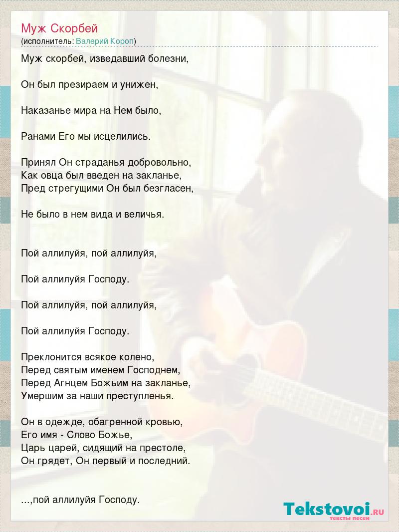 Муж скорбей, изведавший болезни, Он был презираем и унижен, Наказанье мира на Нем было, Ранами Его мы исцелились. Принял Он страданья добровольно, Как овца был введен на закланье, Пред стрегущими Он был безгласен, Не было в нем вида и величья. Пой аллилуйя, пой аллилуйя, Пой аллилуйя Господу. Пой аллилуйя, пой аллилуйя, Пой аллилуйя Господу. Преклонится всякое колено, Перед святым именем Господнем, Перед Агнцем Божьим на закланье, Умершим за наши преступленья. Он в одежде, обагренной кровью, Его имя - Слово Божье, Царь царей, сидящий на престоле, Он грядет, Он первый и последний. ...,пой аллилуйя Господу.