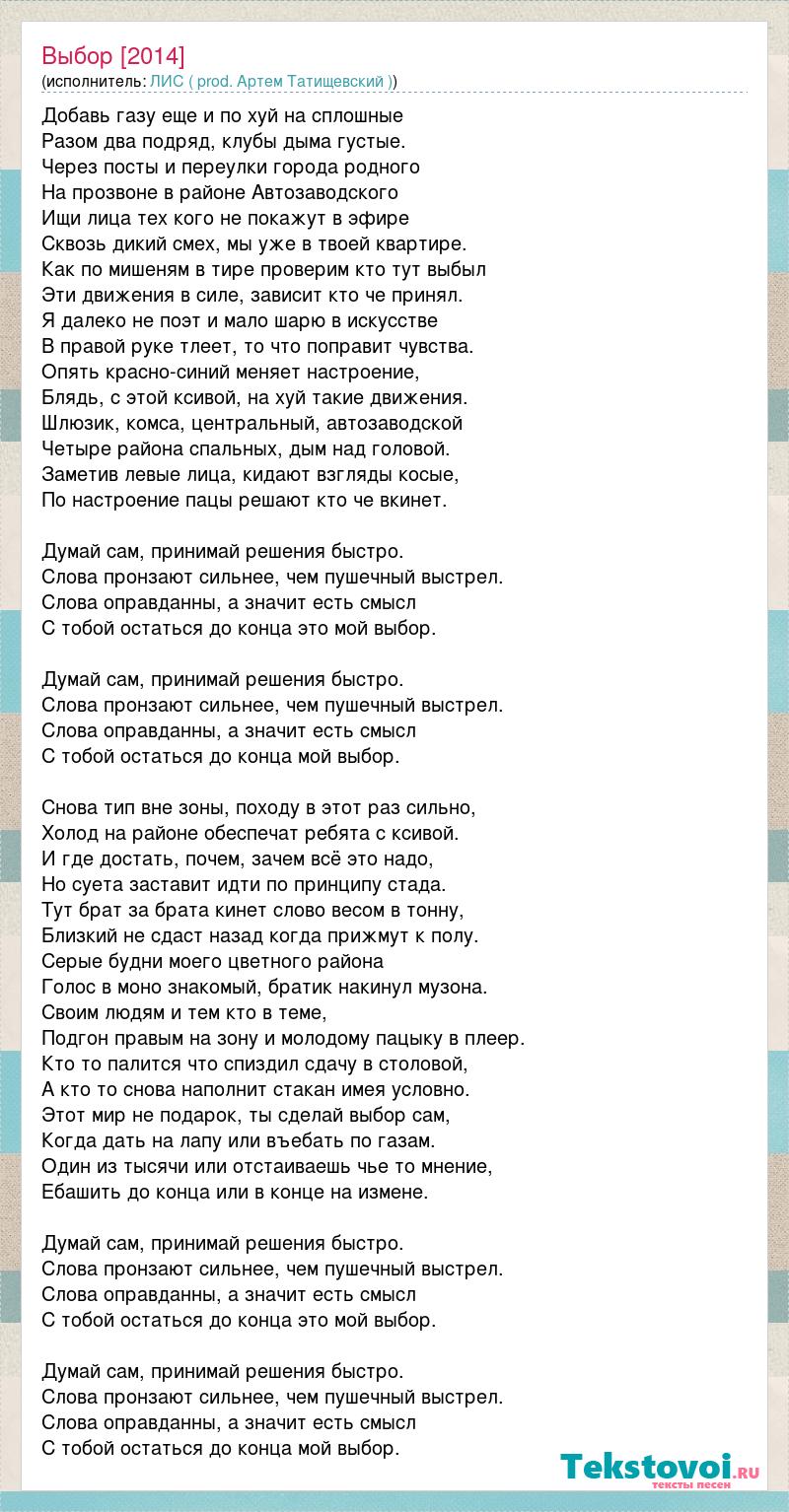 Добавь газу еще и по хуй на сплошные Разом два подряд, клубы дыма густые. Через посты и переулки города родного На прозвоне в районе Автозаводского Ищи лица тех кого не покажут в эфире Сквозь дикий смех, мы уже в твоей квартире. Как по мишеням в тире проверим кто тут выбыл Эти движения в силе, зависит кто че принял. Я далеко не поэт и мало шарю в искусстве В правой руке тлеет, то что поправит чувства. Опять красно-синий меняет настроение, Блядь, с этой ксивой, на хуй такие движения. Шлюзик, комса, центральный, автозаводской Четыре района спальных, дым над головой. Заметив левые лица, кидают взгляды косые, По настроение пацы решают кто че вкинет. Думай сам, принимай решения быстро. Слова пронзают сильнее, чем пушечный выстрел. Слова оправданны, а значит есть смысл С тобой остаться до конца это мой выбор. Думай сам, принимай решения быстро. Слова пронзают сильнее, чем пушечный выстрел. Слова оправданны, а значит есть смысл С тобой остаться до конца мой выбор. Снова тип вне зоны, походу в этот раз сильно, Холод на районе обеспечат ребята с ксивой. И где достать, почем, зачем всё это надо, Но суета заставит идти по принципу стада. Тут брат за брата кинет слово весом в тонну, Близкий не сдаст назад когда прижмут к полу. Серые будни моего цветного района Голос в моно знакомый, братик накинул музона. Своим людям и тем кто в теме, Подгон правым на зону и молодому пацыку в плеер. Кто то палится что спиздил сдачу в столовой, А кто то снова наполнит стакан имея условно. Этот мир не подарок, ты сделай выбор сам, Когда дать на лапу или въебать по газам. Один из тысячи или отстаиваешь чье то мнение, Ебашить до конца или в конце на измене. Думай сам, принимай решения быстро. Слова пронзают сильнее, чем пушечный выстрел. Слова оправданны, а значит есть смысл С тобой остаться до конца это мой выбор. Думай сам, принимай решения быстро. Слова пронзают сильнее, чем пушечный выстрел. Слова оправданны, а значит есть смысл С тобой остаться до конца мой выбор.