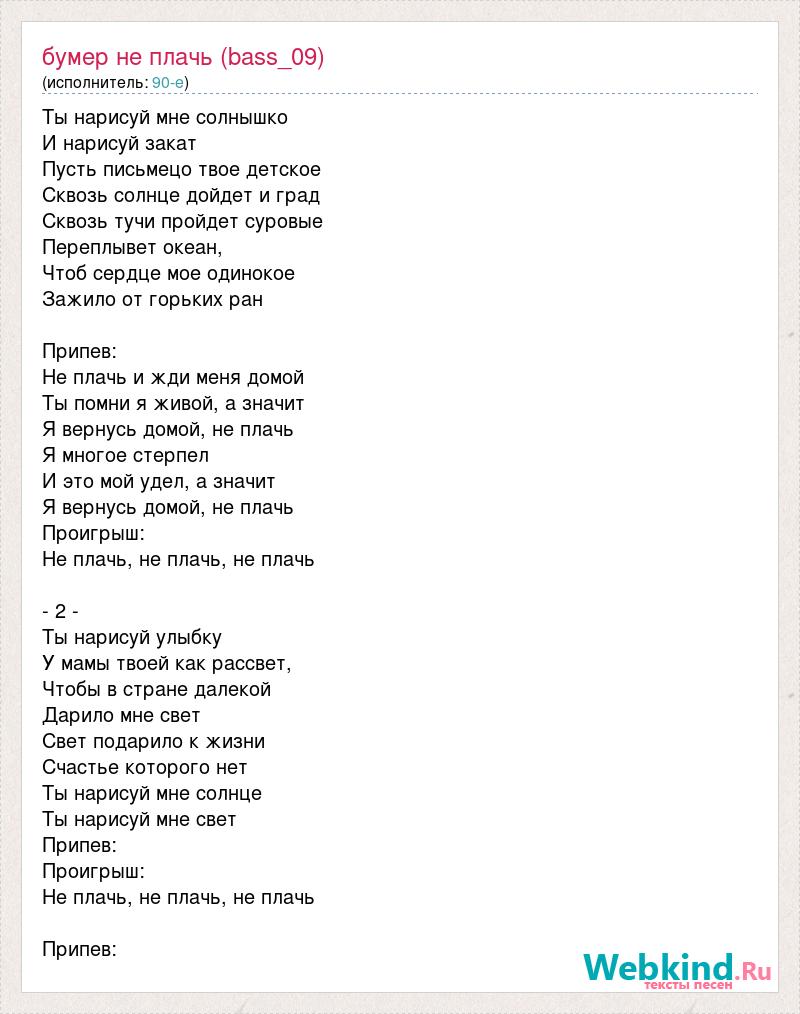 Ты нарисуй мне солнышко И нарисуй закат Пусть письмецо твое детское Сквозь солнце дойдет и град Сквозь тучи пройдет суровые Переплывет океан, Чтоб сердце мое одинокое Зажило от горьких ран Припев: Не плачь и жди меня домой Ты помни я живой, а значит Я вернусь домой, не плачь Я многое стерпел И это мой удел, а значит Я вернусь домой, не плачь Проигрыш: Не плачь, не плачь, не плачь - 2 - Ты нарисуй улыбку У мамы твоей как рассвет, Чтобы в стране далекой Дарило мне свет Свет подарило к жизни Счастье которого нет Ты нарисуй мне солнце Ты нарисуй мне свет Припев: Проигрыш: Не плачь, не плачь, не плачь Припев:
