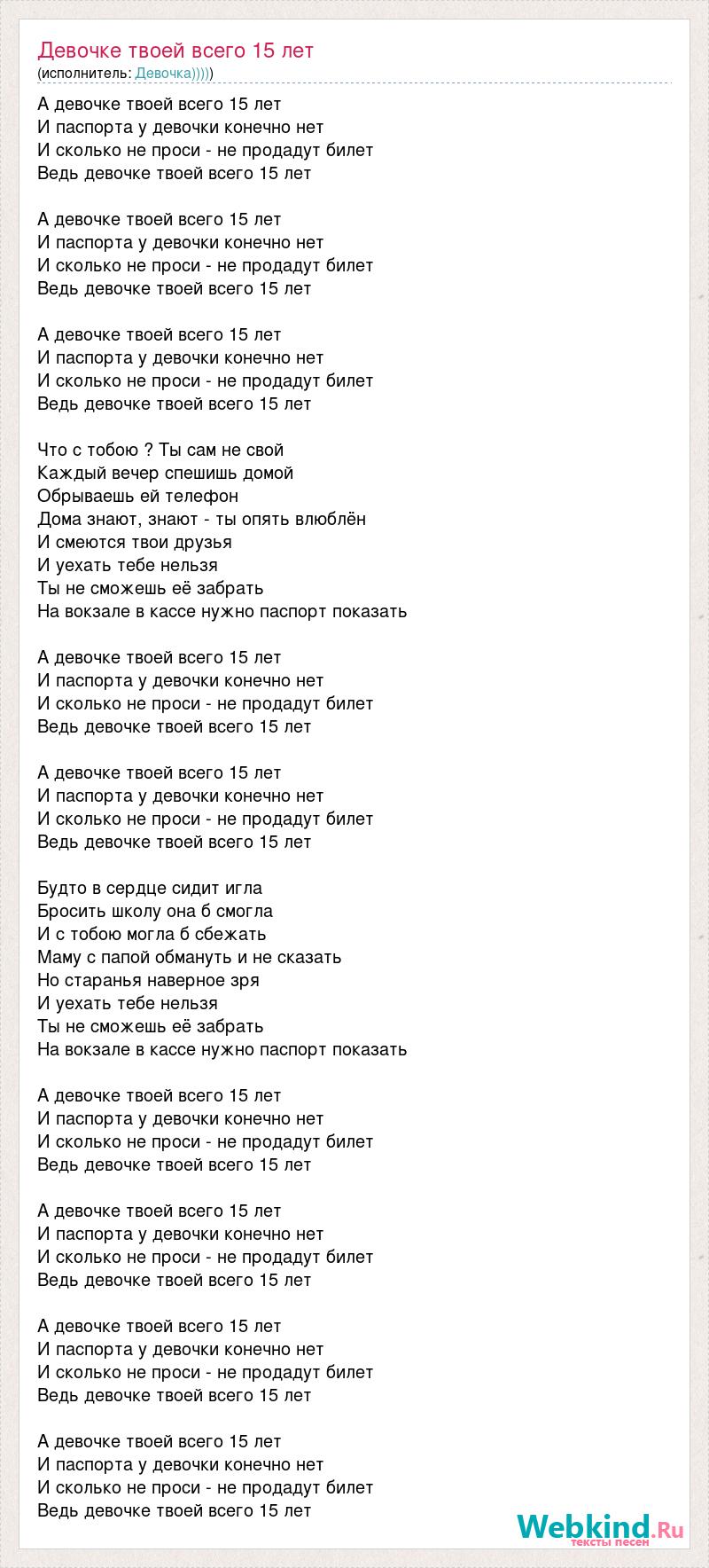 А девочке твоей всего 15 лет И паспорта у девочки конечно нет И сколько не проси - не продадут билет Ведь девочке твоей всего 15 лет А девочке твоей всего 15 лет И паспорта у девочки конечно нет И сколько не проси - не продадут билет Ведь девочке твоей всего 15 лет А девочке твоей всего 15 лет И паспорта у девочки конечно нет И сколько не проси - не продадут билет Ведь девочке твоей всего 15 лет Что с тобою ? Ты сам не свой Каждый вечер спешишь домой Обрываешь ей телефон Дома знают, знают - ты опять влюблён И смеются твои друзья И уехать тебе нельзя Ты не сможешь её забрать На вокзале в кассе нужно паспорт показать А девочке твоей всего 15 лет И паспорта у девочки конечно нет И сколько не проси - не продадут билет Ведь девочке твоей всего 15 лет А девочке твоей всего 15 лет И паспорта у девочки конечно нет И сколько не проси - не продадут билет Ведь девочке твоей всего 15 лет Будто в сердце сидит игла Бросить школу она б смогла И с тобою могла б сбежать Маму с папой обмануть и не сказать Но старанья наверное зря И уехать тебе нельзя Ты не сможешь её забрать На вокзале в кассе нужно паспорт показать А девочке твоей всего 15 лет И паспорта у девочки конечно нет И сколько не проси - не продадут билет Ведь девочке твоей всего 15 лет А девочке твоей всего 15 лет И паспорта у девочки конечно нет И сколько не проси - не продадут билет Ведь девочке твоей всего 15 лет А девочке твоей всего 15 лет И паспорта у девочки конечно нет И сколько не проси - не продадут билет Ведь девочке твоей всего 15 лет А девочке твоей всего 15 лет И паспорта у девочки конечно нет И сколько не проси - не продадут билет Ведь девочке твоей всего 15 лет