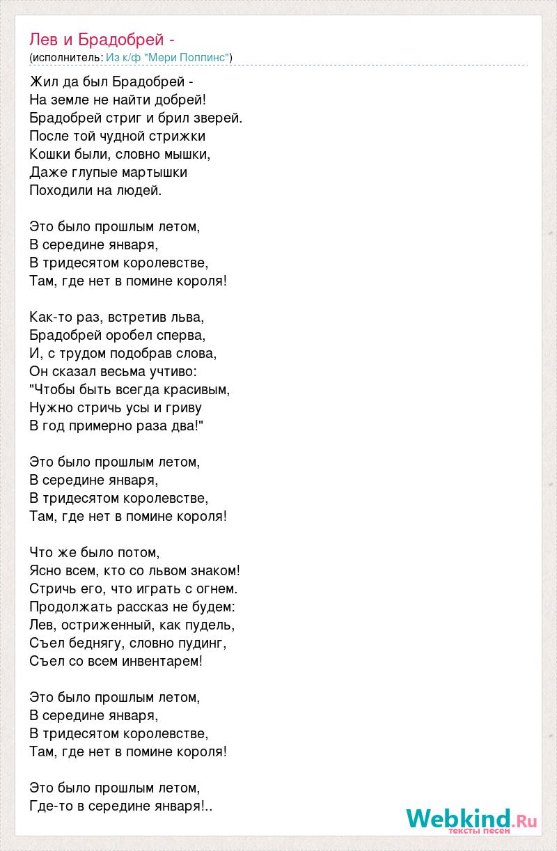 Жил да был Брадобрей - Hа земле не найти добрей! Брадобрей стриг и брил зверей. После той чудной стрижки Кошки были, словно мышки, Даже глупые мартышки Походили на людей. Это было прошлым летом, В середине января, В тридесятом королевстве, Там, где нет в помине короля! Как-то раз, встретив льва, Брадобрей оробел сперва, И, с трудом подобрав слова, Он сказал весьма учтиво: "Чтобы быть всегда красивым, Нужно стричь усы и гриву В год примерно раза два!" Это было прошлым летом, В середине января, В тридесятом королевстве, Там, где нет в помине короля! Что же было потом, Ясно всем, кто со львом знаком! Стричь его, что играть с огнем. Продолжать рассказ не будем: Лев, остриженный, как пудель, Съел беднягу, словно пудинг, Съел со всем инвентарем! Это было прошлым летом, В середине января, В тридесятом королевстве, Там, где нет в помине короля! Это было прошлым летом, Где-то в середине января!..