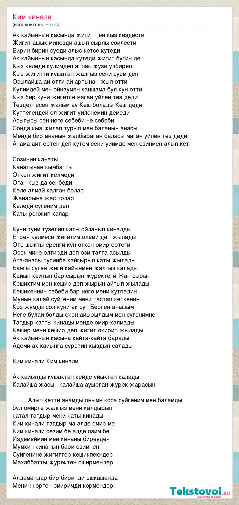 Ак кайыннын касында жигит пен кыз кездести Жигит ашык минезди ашып сырлы сойлести Бирин бирин суеди алыс кетсе кутеди Ак кайыннын касында кутеди жигит бугин де Кыз келеди кулимдеп аппак жузи улбиреп Кыз жигитти кушатап жалгыз сени суем деп Осылайша ай отти ай артынан жыл отти Кулимдей мен ойнаумен каншама бул кун отти Кыз бир куни жигитке маган уйлен тез деди Тездетпесен жаным ау Кеш болады Кеш деди Кутпегендей ол жигит уйленемин демеди Асыгысы сен неге себеби не себеби Сонда кыз жилап турып мен баланын анасы Менде бир ананын жалбыраган баласы маган уйлен тез деди Анама айт ертен деп кутем сени уйимде мен озинмен алып кет. Созинин канаты Канатынан кымбатты Откен жигит келмеди Оган кыз да сенбеди Келе алмай калган болар Жанарына жас толар Келеди сугеним деп Каты ренжип калар Куни туни тузелип каты ойланып киналды Етрен келмесе жигитим олеми деп жылады Оте шыкты еренги кун откен омир ертеги Осек мине олтирди деп ози талга асылды Ата-анасы тусинбе кайгырып каты жылады Баягы суген жиги кайынмен жалгыз калады Кайын кайтып бар сырын журектеги Жан сырын Кешиктим мен кешир деп жырын айтып жылады Кешикеннин себеби бар неге мени кутпедин Мунын калай суйгеним мени тастап кеткенин Коз жумды сол куни ак сут Берген анашым Неге булай болды екен айырылдым мен сугенимнен Тагдыр катты кинады менде омир калмады Кешир мени кешир деп жигит окирип жылады Ак кайыннын касына кайта-кайта барады Адеми ак кайынга суретин кыздын салады Ким кинали Ким кинали Ак кайынды кушактап кейде уйыктап калады Калайша жасын калайша ауырган журек жарасын ……. Алып кетти анамды онымн коса суйгеним мен баламды бул омирге жалгыз мени калдырып катал тагдыр мени каты кинады Ким кинали тагдыр ма алде омир ме Ким кинали сезим бе алде озим бе Издемеймин мен кинаны биреуден Мумкин кинанын бари озимнен Суйгенине жигиттер кешикпекндер Махаббатты журектен оширмендер Алдамандар бир биринди ешкашанда Менин корген омиримди кормендер.