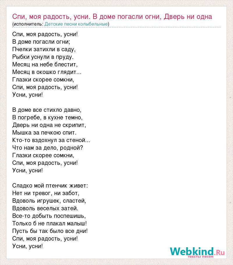 Спи, моя радость, усни! В доме погасли огни; Пчелки затихли в саду, Рыбки уснули в пруду. Месяц на небе блестит, Месяц в окошко глядит... Глазки скорее сомкни, Спи, моя радость, усни! Усни, усни! В доме все стихло давно, В погребе, в кухне темно, Дверь ни одна не скрипит, Мышка за печкою спит. Кто-то вздохнул за стеной... Что нам за дело, родной? Глазки скорее сомкни, Спи, моя радость, усни! Усни, усни! Сладко мой птенчик живет: Нет ни тревог, ни забот, Вдоволь игрушек, сластей, Вдоволь веселых затей. Все-то добыть поспешишь, Только б не плакал малыш! Пусть бы так было все дни! Спи, моя радость, усни! Усни, усни!