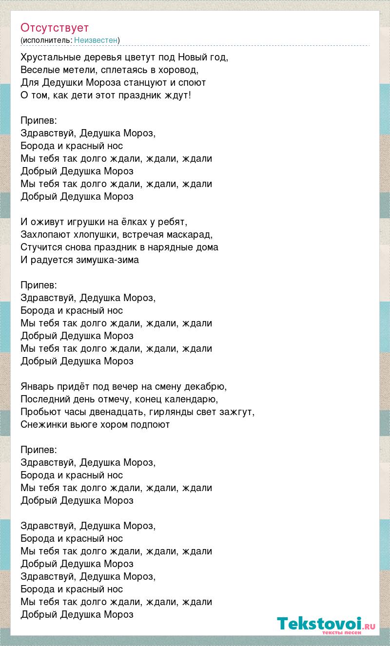 Хрустальные деревья цветут под Новый год, Веселые метели, сплетаясь в хоровод, Для Дедушки Мороза станцуют и споют О том, как дети этот праздник ждут! Припев: Здравствуй, Дедушка Мороз, Борода и красный нос Мы тебя так долго ждали, ждали, ждали Добрый Дедушка Мороз Мы тебя так долго ждали, ждали, ждали Добрый Дедушка Мороз И оживут игрушки на ёлках у ребят, Захлопают хлопушки, встречая маскарад, Стучится снова праздник в нарядные дома И радуется зимушка-зима Припев: Здравствуй, Дедушка Мороз, Борода и красный нос Мы тебя так долго ждали, ждали, ждали Добрый Дедушка Мороз Мы тебя так долго ждали, ждали, ждали Добрый Дедушка Мороз Январь придёт под вечер на смену декабрю, Последний день отмечу, конец календарю, Пробьют часы двенадцать, гирлянды свет зажгут, Снежинки вьюге хором подпоют Припев: Здравствуй, Дедушка Мороз, Борода и красный нос Мы тебя так долго ждали, ждали, ждали Добрый Дедушка Мороз Здравствуй, Дедушка Мороз, Борода и красный нос Мы тебя так долго ждали, ждали, ждали Добрый Дедушка Мороз Здравствуй, Дедушка Мороз, Борода и красный нос Мы тебя так долго ждали, ждали, ждали Добрый Дедушка Мороз