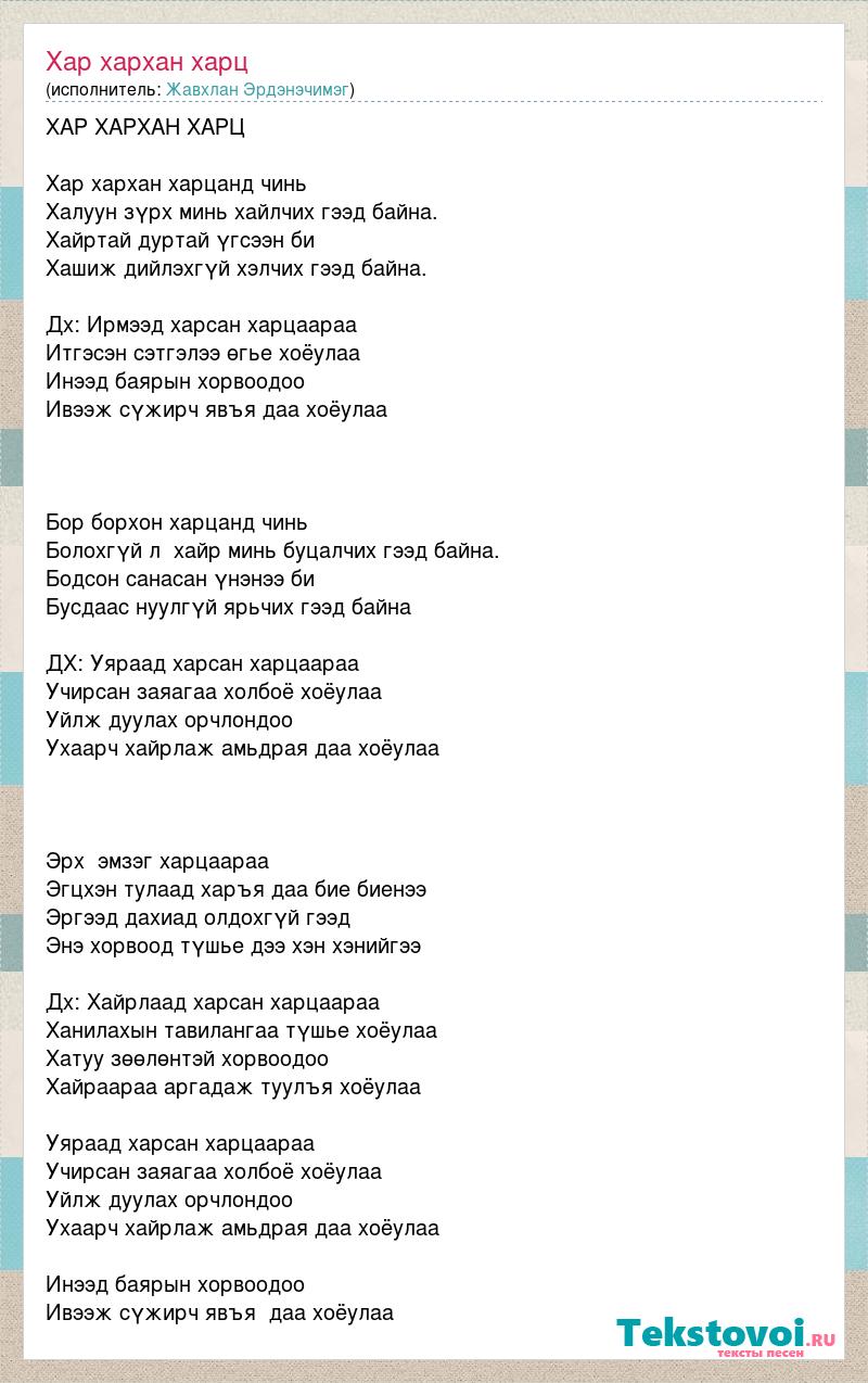 ХАР ХАРХАН ХАРЦ Хар хархан харцанд чинь Халуун зүрх минь хайлчих гээд байна. Хайртай дуртай үгсээн би Хашиж дийлэхгүй хэлчих гээд байна. Дх: Ирмээд харсан харцаараа Итгэсэн сэтгэлээ өгье хоёулаа Инээд баярын хорвоодоо Ивээж сүжирч явъя даа хоёулаа Бор борхон харцанд чинь Болохгүй л хайр минь буцалчих гээд байна. Бодсон санасан үнэнээ би Бусдаас нуулгүй ярьчих гээд байна ДХ: Уяраад харсан харцаараа Учирсан заяагаа холбоё хоёулаа Уйлж дуулах орчлондоо Ухаарч хайрлаж амьдрая даа хоёулаа Эрх эмзэг харцаараа Эгцхэн тулаад харъя даа бие биенээ Эргээд дахиад олдохгүй гээд Энэ хорвоод түшье дээ хэн хэнийгээ Дх: Хайрлаад харсан харцаараа Ханилахын тавилангаа түшье хоёулаа Хатуу зөөлөнтэй хорвоодоо Хайраараа аргадаж туулъя хоёулаа Уяраад харсан харцаараа Учирсан заяагаа холбоё хоёулаа Уйлж дуулах орчлондоо Ухаарч хайрлаж амьдрая даа хоёулаа Инээд баярын хорвоодоо Ивээж сүжирч явъя даа хоёулаа