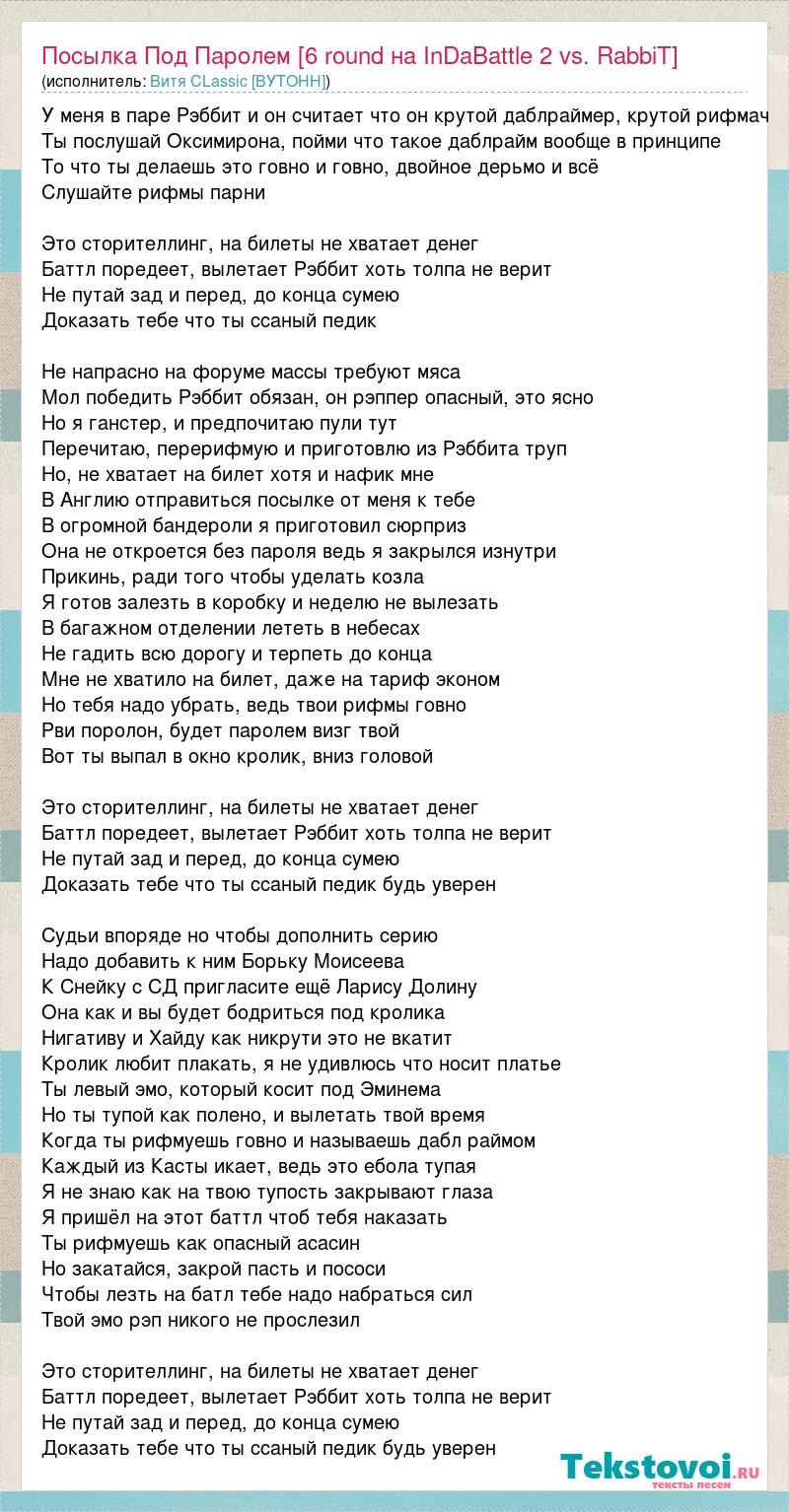 У меня в паре Рэббит и он считает что он крутой даблраймер, крутой рифмач Ты послушай Оксимирона, пойми что такое даблрайм вообще в принципе То что ты делаешь это говно и говно, двойное дерьмо и всё Слушайте рифмы парни Это сторителлинг, на билеты не хватает денег Баттл поредеет, вылетает Рэббит хоть толпа не верит Не путай зад и перед, до конца сумею Доказать тебе что ты ссаный педик Не напрасно на форуме массы требуют мяса Мол победить Рэббит обязан, он рэппер опасный, это ясно Но я ганстер, и предпочитаю пули тут Перечитаю, перерифмую и приготовлю из Рэббита труп Но, не хватает на билет хотя и нафик мне В Англию отправиться посылке от меня к тебе В огромной бандероли я приготовил сюрприз Она не откроется без пароля ведь я закрылся изнутри Прикинь, ради того чтобы уделать козла Я готов залезть в коробку и неделю не вылезать В багажном отделении лететь в небесах Не гадить всю дорогу и терпеть до конца Мне не хватило на билет, даже на тариф эконом Но тебя надо убрать, ведь твои рифмы говно Рви поролон, будет паролем визг твой Вот ты выпал в окно кролик, вниз головой Это сторителлинг, на билеты не хватает денег Баттл поредеет, вылетает Рэббит хоть толпа не верит Не путай зад и перед, до конца сумею Доказать тебе что ты ссаный педик будь уверен Судьи впоряде но чтобы дополнить серию Надо добавить к ним Борьку Моисеева К Снейку с СД пригласите ещё Ларису Долину Она как и вы будет бодриться под кролика Нигативу и Хайду как никрути это не вкатит Кролик любит плакать, я не удивлюсь что носит платье Ты левый эмо, который косит под Эминема Но ты тупой как полено, и вылетать твой время Когда ты рифмуешь говно и называешь дабл раймом Каждый из Касты икает, ведь это ебола тупая Я не знаю как на твою тупость закрывают глаза Я пришёл на этот баттл чтоб тебя наказать Ты рифмуешь как опасный асасин Но закатайся, закрой пасть и пососи Чтобы лезть на батл тебе надо набраться сил Твой эмо рэп никого не прослезил Это сторителлинг, на билеты не хватает денег Баттл поредеет, вылетает Рэббит хоть толпа не верит Не путай зад и перед, до конца сумею Доказать тебе что ты ссаный педик будь уверен