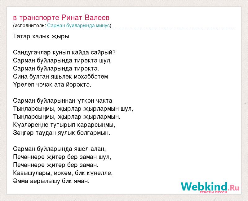 Татар халык җыры Сандугачлар кунып кайда сайрый? Сарман буйларында тирәктә шул, Сарман буйларында тирәктә. Сиңа булган яшьлек мәхәббәтем Үрелеп чәчәк ата йөрәктә. Сарман буйларыннан үткән чакта Тыңларсыңмы, җырлар җырлармын шул, Тыңларсыңмы, җырлар җырлармын. Күзләреңне тутырып карарсыңмы, Зәңгәр таудан яулык болгармын. Сарман буйларында яшел алан, Печәннәре җитәр бер заман шул, Печәннәре җитәр бер заман. Кавышулары, иркәм, бик күңелле, Әмма аерылышу бик яман.