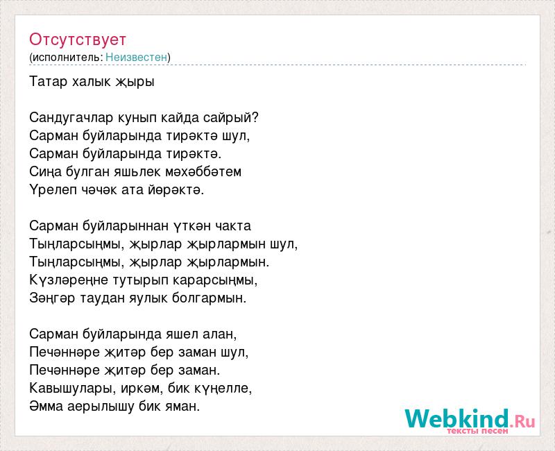 Татар халык җыры Сандугачлар кунып кайда сайрый? Сарман буйларында тирәктә шул, Сарман буйларында тирәктә. Сиңа булган яшьлек мәхәббәтем Үрелеп чәчәк ата йөрәктә. Сарман буйларыннан үткән чакта Тыңларсыңмы, җырлар җырлармын шул, Тыңларсыңмы, җырлар җырлармын. Күзләреңне тутырып карарсыңмы, Зәңгәр таудан яулык болгармын. Сарман буйларында яшел алан, Печәннәре җитәр бер заман шул, Печәннәре җитәр бер заман. Кавышулары, иркәм, бик күңелле, Әмма аерылышу бик яман.