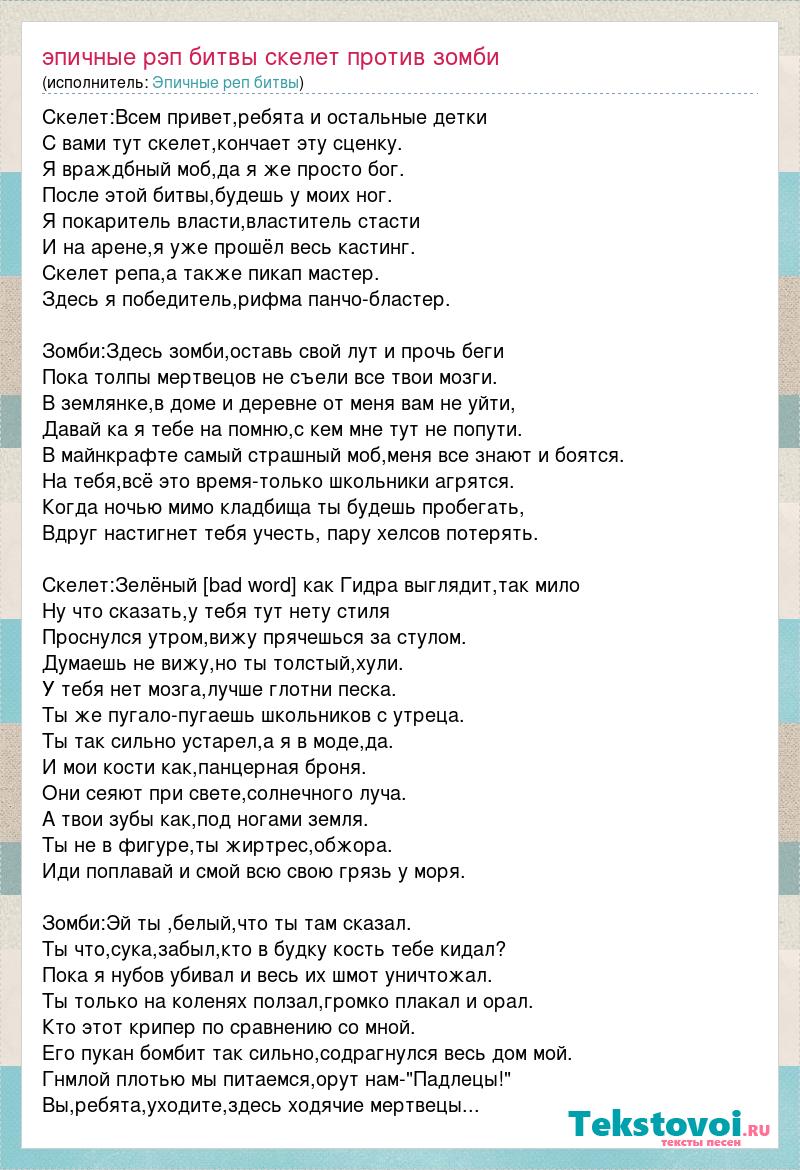 Скелет:Всем привет,ребята и остальные детки С вами тут скелет,кончает эту сценку. Я враждбный моб,да я же просто бог. После этой битвы,будешь у моих ног. Я покаритель власти,властитель стасти И на арене,я уже прошёл весь кастинг. Скелет репа,а также пикап мастер. Здесь я победитель,рифма панчо-бластер. Зомби:Здесь зомби,оставь свой лут и прочь беги Пока толпы мертвецов не съели все твои мозги. В землянке,в доме и деревне от меня вам не уйти, Давай ка я тебе на помню,с кем мне тут не попути. В майнкрафте самый страшный моб,меня все знают и боятся. На тебя,всё это время-только школьники агрятся. Когда ночью мимо кладбища ты будешь пробегать, Вдруг настигнет тебя учесть, пару хелсов потерять. Скелет:Зелёный [bad word] как Гидра выглядит,так мило Ну что сказать,у тебя тут нету стиля Проснулся утром,вижу прячешься за стулом. Думаешь не вижу,но ты толстый,хули. У тебя нет мозга,лучше глотни песка. Ты же пугало-пугаешь школьников с утреца. Ты так сильно устарел,а я в моде,да. И мои кости как,панцерная броня. Они сеяют при свете,солнечного луча. А твои зубы как,под ногами земля. Ты не в фигуре,ты жиртрес,обжора. Иди поплавай и смой всю свою грязь у моря. Зомби:Эй ты ,белый,что ты там сказал. Ты что,сука,забыл,кто в будку кость тебе кидал? Пока я нубов убивал и весь их шмот уничтожал. Ты только на коленях ползал,громко плакал и орал. Кто этот крипер по сравнению со мной. Его пукан бомбит так сильно,содрагнулся весь дом мой. Гнмлой плотью мы питаемся,орут нам-"Падлецы!" Вы,ребята,уходите,здесь ходячие мертвецы...