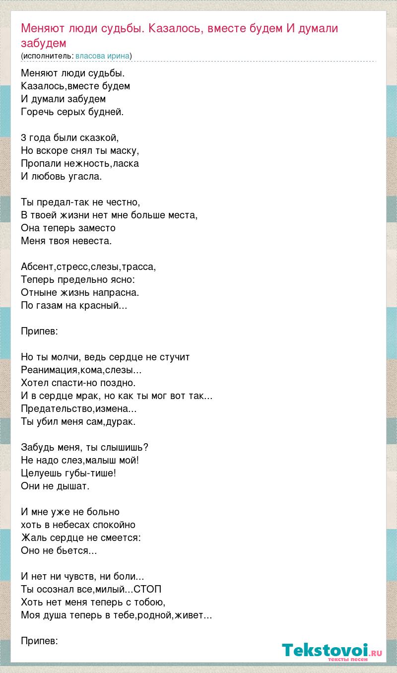 Главная→Исполнители→Власова ирина→Меняют люди судьбы. Казалось, вместе будем И думали забудем горечь серых будн