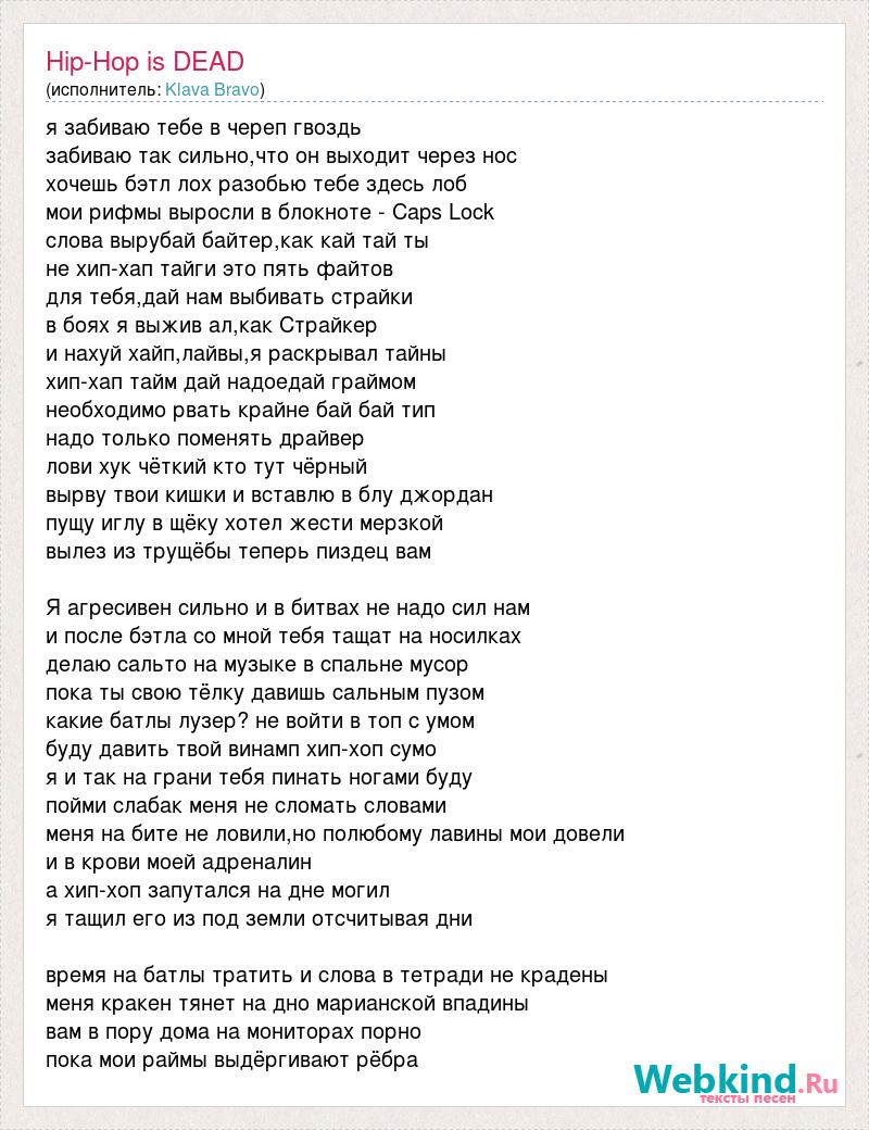 я забиваю тебе в череп гвоздь забиваю так сильно,что он выходит через нос хочешь бэтл лох разобью тебе здесь лоб мои рифмы выросли в блокноте - Caps Lock слова вырубай байтер,как кай тай ты не хип-хап тайги это пять файтов для тебя,дай нам выбивать страйки в боях я выжив ал,как Страйкер и нахуй хайп,лайвы,я раскрывал тайны хип-хап тайм дай надоедай граймом необходимо рвать крайне бай бай тип надо только поменять драйвер лови хук чёткий кто тут чёрный вырву твои кишки и вставлю в блу джордан пущу иглу в щёку хотел жести мерзкой вылез из трущёбы теперь пиздец вам Я агресивен сильно и в битвах не надо сил нам и после бэтла со мной тебя тащат на носилках делаю сальто на музыке в спальне мусор пока ты свою тёлку давишь сальным пузом какие батлы лузер? не войти в топ с умом буду давить твой винамп хип-хоп сумо я и так на грани тебя пинать ногами буду пойми слабак меня не сломать словами меня на бите не ловили,но полюбому лавины мои довели и в крови моей адреналин а хип-хоп запутался на дне могил я тащил его из под земли отсчитывая дни время на батлы тратить и слова в тетради не крадены меня кракен тянет на дно марианской впадины вам в пору дома на мониторах порно пока мои раймы выдёргивают рёбра