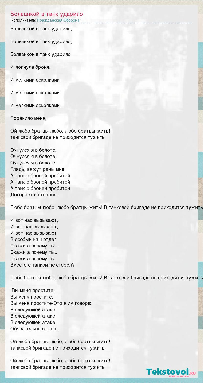 Болванкой в танк ударило, Болванкой в танк ударило, Болванкой в танк ударило И лопнула броня. И мелкими осколками И мелкими осколками И мелкими осколками Поранило меня, Ой любо братцы любо, любо братцы жить! танковой бригаде не приходится тужить Очнулся я в болоте, Очнулся я в болоте, Очнулся я в болоте Глядь, вяжут раны мне А танк с броней пробитой А танк с броней пробитой А танк с броней пробитой Догорает в стороне. Любо братцы любо, любо братцы жить! В танковой бригаде не приходится тужить И вот нас вызывают, И вот нас вызывают, И вот нас вызывают В особый наш отдел Скажи а почему ты... Скажи а почему ты... Скажи а почему ты Вместе с танком не сгорел? Любо братцы любо, любо братцы жить! В танковой бригаде не приходится тужить Вы меня простите, Вы меня простите, Вы меня простите-Это я им говорю В следующей атаке В следующей атаке В следующей атаке Обязательно сгорю. Ой любо братцы любо, любо братцы жить! танковой бригаде не приходится тужить Ой любо братцы любо, любо братцы жить! танковой бригаде не приходится тужить