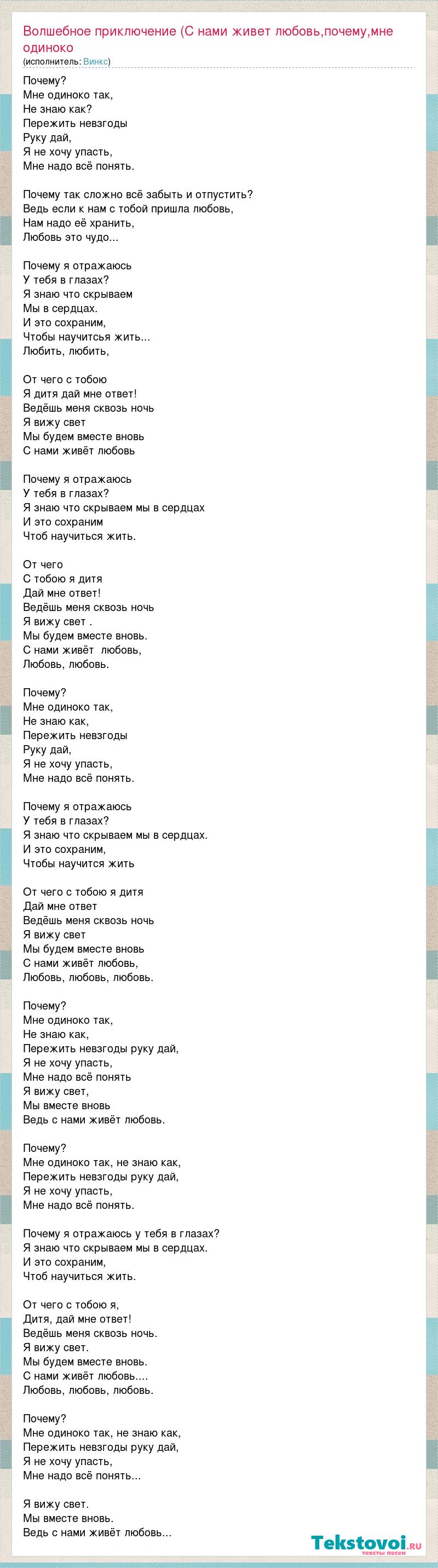 Почему? Мне одиноко так, Не знаю как? Пережить невзгоды Руку дай, Я не хочу упасть, Мне надо всё понять. Почему так сложно всё забыть и отпустить? Ведь если к нам с тобой пришла любовь, Нам надо её хранить, Любовь это чудо... Почему я отражаюсь У тебя в глазах? Я знаю что скрываем Мы в сердцах. И это сохраним, Чтобы научитсья жить... Любить, любить, От чего с тобою Я дитя дай мне ответ! Ведёшь меня сквозь ночь Я вижу свет Мы будем вместе вновь С нами живёт любовь Почему я отражаюсь У тебя в глазах? Я знаю что скрываем мы в сердцах И это сохраним Чтоб научиться жить. От чего С тобою я дитя Дай мне ответ! Ведёшь меня сквозь ночь Я вижу свет . Мы будем вместе вновь. С нами живёт любовь, Любовь, любовь. Почему? Мне одиноко так, Не знаю как, Пережить невзгоды Руку дай, Я не хочу упасть, Мне надо всё понять. Почему я отражаюсь У тебя в глазах? Я знаю что скрываем мы в сердцах. И это сохраним, Чтобы научится жить От чего с тобою я дитя Дай мне ответ Ведёшь меня сквозь ночь Я вижу свет Мы будем вместе вновь С нами живёт любовь, Любовь, любовь, любовь. Почему? Мне одиноко так, Не знаю как, Пережить невзгоды руку дай, Я не хочу упасть, Мне надо всё понять Я вижу свет, Мы вместе вновь Ведь с нами живёт любовь. Почему? Мне одиноко так, не знаю как, Пережить невзгоды руку дай, Я не хочу упасть, Мне надо всё понять. Почему я отражаюсь у тебя в глазах? Я знаю что скрываем мы в сердцах. И это сохраним, Чтоб научиться жить. От чего с тобою я, Дитя, дай мне ответ! Ведёшь меня сквозь ночь. Я вижу свет. Мы будем вместе вновь. С нами живёт любовь.... Любовь, любовь, любовь. Почему? Мне одиноко так, не знаю как, Пережить невзгоды руку дай, Я не хочу упасть, Мне надо всё понять... Я вижу свет. Мы вместе вновь. Ведь с нами живёт любовь...