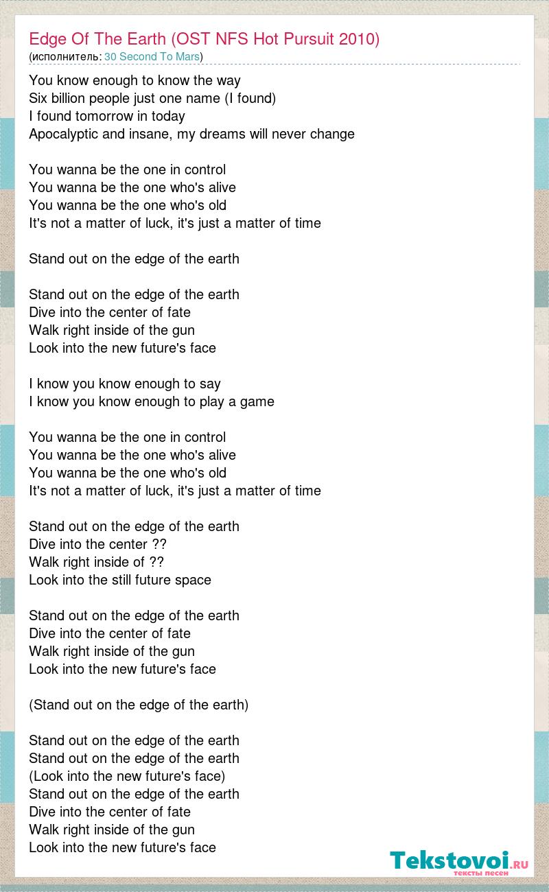 А как ты думаешь, о чем песня "Edge Of The Earth (OST NFS Hot Pursuit 2010)" ?