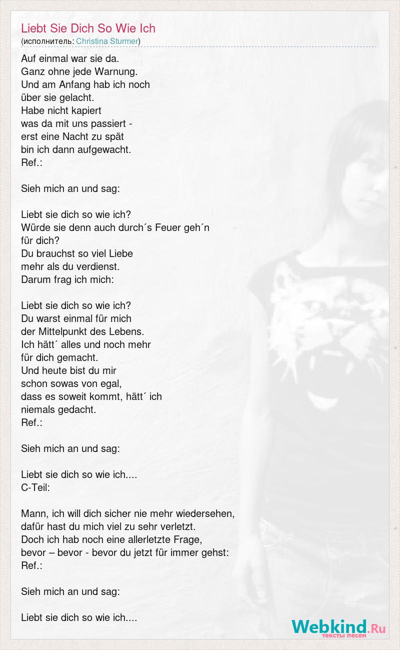 Auf einmal war sie da. Ganz ohne jede Warnung. Und am Anfang hab ich noch über sie gelacht. Habe nicht kapiert was da mit uns passiert - erst eine Nacht zu spät bin ich dann aufgewacht. Ref.: Sieh mich an und sag: Liebt sie dich so wie ich? Würde sie denn auch durch´s Feuer geh´n für dich? Du brauchst so viel Liebe mehr als du verdienst. Darum frag ich mich: Liebt sie dich so wie ich? Du warst einmal für mich der Mittelpunkt des Lebens. Ich hätt´ alles und noch mehr für dich gemacht. Und heute bist du mir schon sowas von egal, dass es soweit kommt, hätt´ ich niemals gedacht. Ref.: Sieh mich an und sag: Liebt sie dich so wie ich.... C-Teil: Mann, ich will dich sicher nie mehr wiedersehen, dafür hast du mich viel zu sehr verletzt. Doch ich hab noch eine allerletzte Frage, bevor – bevor - bevor du jetzt für immer gehst: Ref.: Sieh mich an und sag: Liebt sie dich so wie ich....