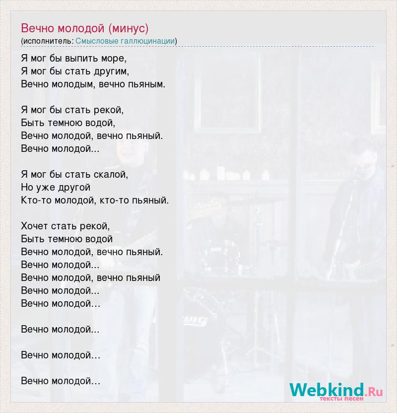 Я мог бы выпить море, Я мог бы стать другим, Вечно молодым, вечно пьяным. Я мог бы стать рекой, Быть темною водой, Вечно молодой, вечно пьяный. Вечно молодой... Я мог бы стать скалой, Но уже другой Кто-то молодой, кто-то пьяный. Хочет стать рекой, Быть темною водой Вечно молодой, вечно пьяный. Вечно молодой... Вечно молодой, вечно пьяный Вечно молодой... Вечно молодой… Вечно молодой... Вечно молодой… Вечно молодой…