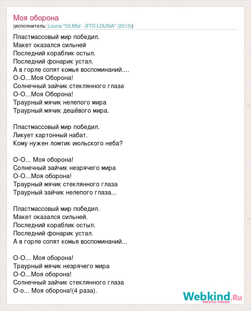 Пластмассовый мир победил. Макет оказался сильней Последний кораблик остыл. Последний фонарик устал. А в горле сопят комья воспоминаний.... О-О...Моя Оборона! Солнечный зайчик стеклянного глаза О-О...Моя Оборона! Траурный мячик нелепого мира Траурный мячик дешёвого мира. Пластмассовый мир победил. Ликует картонный набат. Кому нужен ломтик июльского неба? О-О... Моя оборона! Солнечный зайчик незрячего мира О-О...Моя оборона! Траурный мячик стеклянного глаза Траурный зайчик нелепого глаза... Пластмассовый мир победил. Макет оказался сильней. Последний кораблик остыл. Последний фонарик устал. А в горле сопят комья воспоминаний... О-О... Моя оборона! Траурный мячик незрячего мира О-О...Моя оборона! Солнечный зайчик стеклянного глаза О-о... Моя оборона!(4 раза).