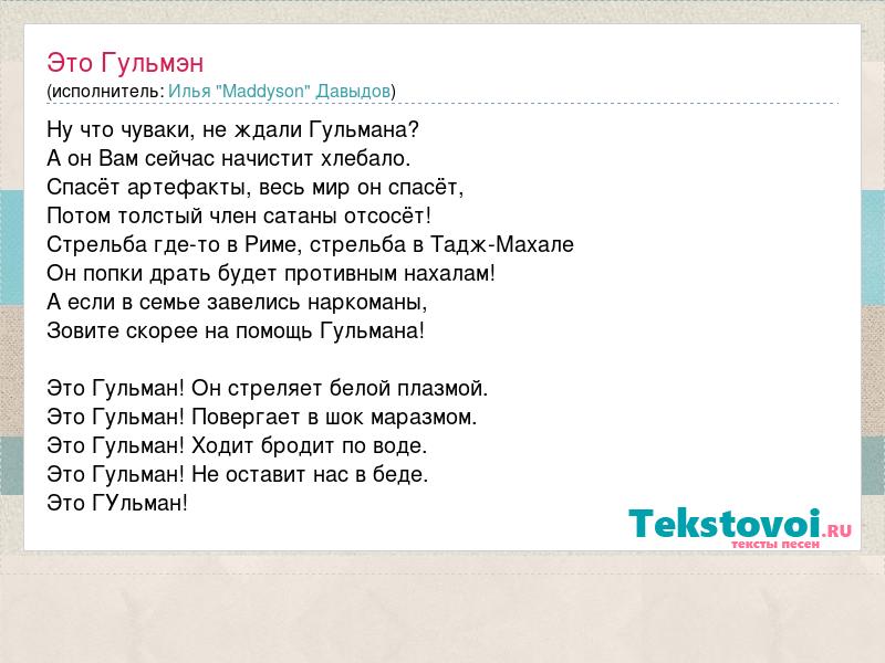 Ну что чуваки, не ждали Гульмана? А он Вам сейчас начистит хлебало. Спасёт артефакты, весь мир он спасёт, Потом толстый член сатаны отсосёт! Стрельба где-то в Риме, стрельба в Тадж-Махале Он попки драть будет противным нахалам! А если в семье завелись наркоманы, Зовите скорее на помощь Гульмана! Это Гульман! Он стреляет белой плазмой. Это Гульман! Повергает в шок маразмом. Это Гульман! Ходит бродит по воде. Это Гульман! Не оставит нас в беде. Это ГУльман!