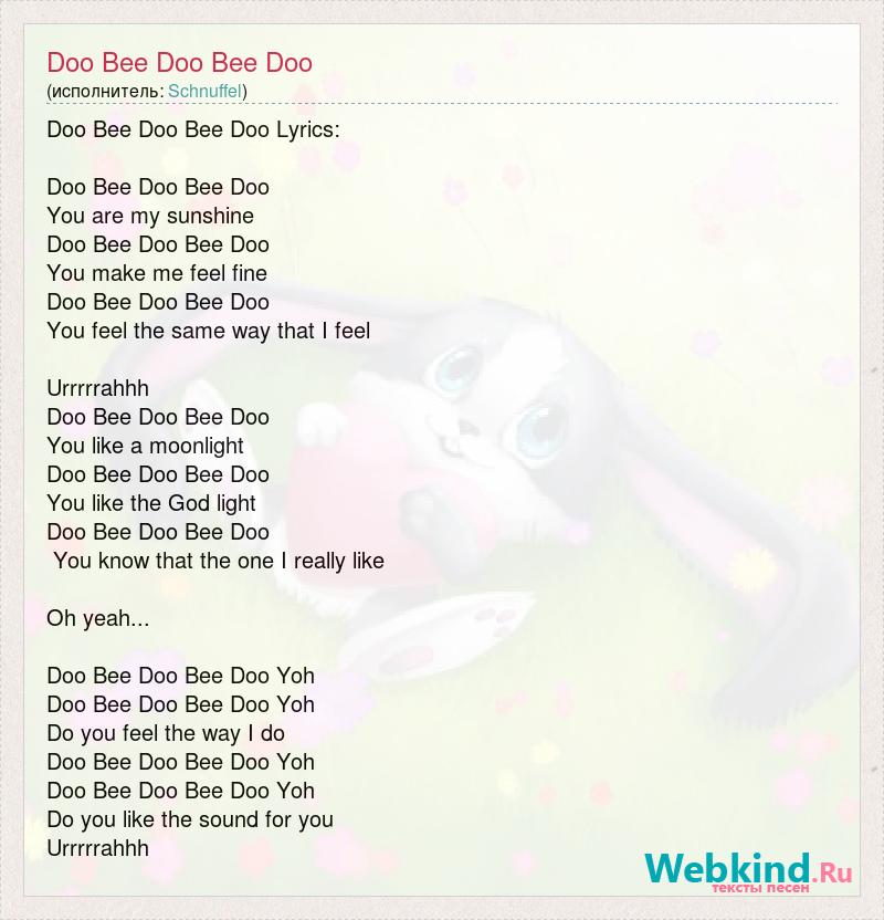 Doo Bee Doo Bee Doo Lyrics: Doo Bee Doo Bee Doo You are my sunshine Doo Bee Doo Bee Doo You make me feel fine Doo Bee Doo Bee Doo You feel the same way that I feel Urrrrrahhh Doo Bee Doo Bee Doo You like a moonlight Doo Bee Doo Bee Doo You like the God light Doo Bee Doo Bee Doo You know that the one I really like Oh yeah... Doo Bee Doo Bee Doo Yoh Doo Bee Doo Bee Doo Yoh Do you feel the way I do Doo Bee Doo Bee Doo Yoh Doo Bee Doo Bee Doo Yoh Do you like the sound for you Urrrrrahhh