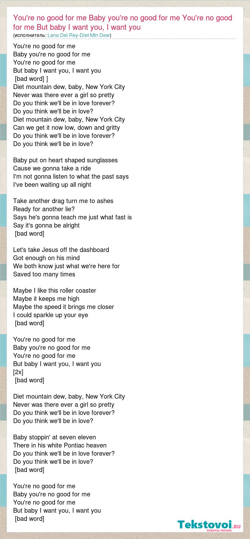 You're no good for me Baby you're no good for me You're no good for me But baby I want you, I want you [Chorus:] Diet mountain dew, baby, New York City Never was there ever a girl so pretty Do you think we'll be in love forever? Do you think we'll be in love? Diet mountain dew, baby, New York City Can we get it now low, down and gritty Do you think we'll be in love forever? Do you think we'll be in love? Baby put on heart shaped sunglasses Cause we gonna take a ride I'm not gonna listen to what the past says I've been waiting up all night Take another drag turn me to ashes Ready for another lie? Says he's gonna teach me just what fast is Say it's gonna be alright [Chorus] Let's take Jesus off the dashboard Got enough on his mind We both know just what we're here for Saved too many times Maybe I like this roller coaster Maybe it keeps me high Maybe the speed it brings me closer I could sparkle up your eye [Chorus] You're no good for me Baby you're no good for me You're no good for me But baby I want you, I want you [2x] [Chorus] Diet mountain dew, baby, New York City Never was there ever a girl so pretty Do you think we'll be in love forever? Do you think we'll be in love? Baby stoppin' at seven eleven There in his white Pontiac heaven Do you think we'll be in love forever? Do you think we'll be in love? [Chorus] You're no good for me Baby you're no good for me You're no good for me But baby I want you, I want you [Chorus]