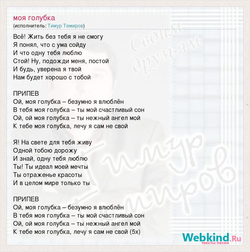 Всё! Жить без тебя я не смогу Я понял, что с ума сойду И что одну тебя люблю Стой! Ну, подожди меня, постой И будь, уверена я твой Нам будет хорошо с тобой ПРИПЕВ Ой, моя голубка – безумно я влюблён В тебя моя голубка – ты мой счастливый сон Ой, ой моя голубка – ты нежный ангел мой К тебе моя голубка, лечу я сам не свой Я! На свете для тебя живу Одной тобою дорожу И знай, одну тебя люблю Ты! Ты идеал моей мечты Ты отраженье красоты И в целом мире только ты ПРИПЕВ Ой, моя голубка – безумно я влюблён В тебя моя голубка – ты мой счастливый сон Ой, ой моя голубка – ты нежный ангел мой К тебе моя голубка, лечу я сам не свой (5х)