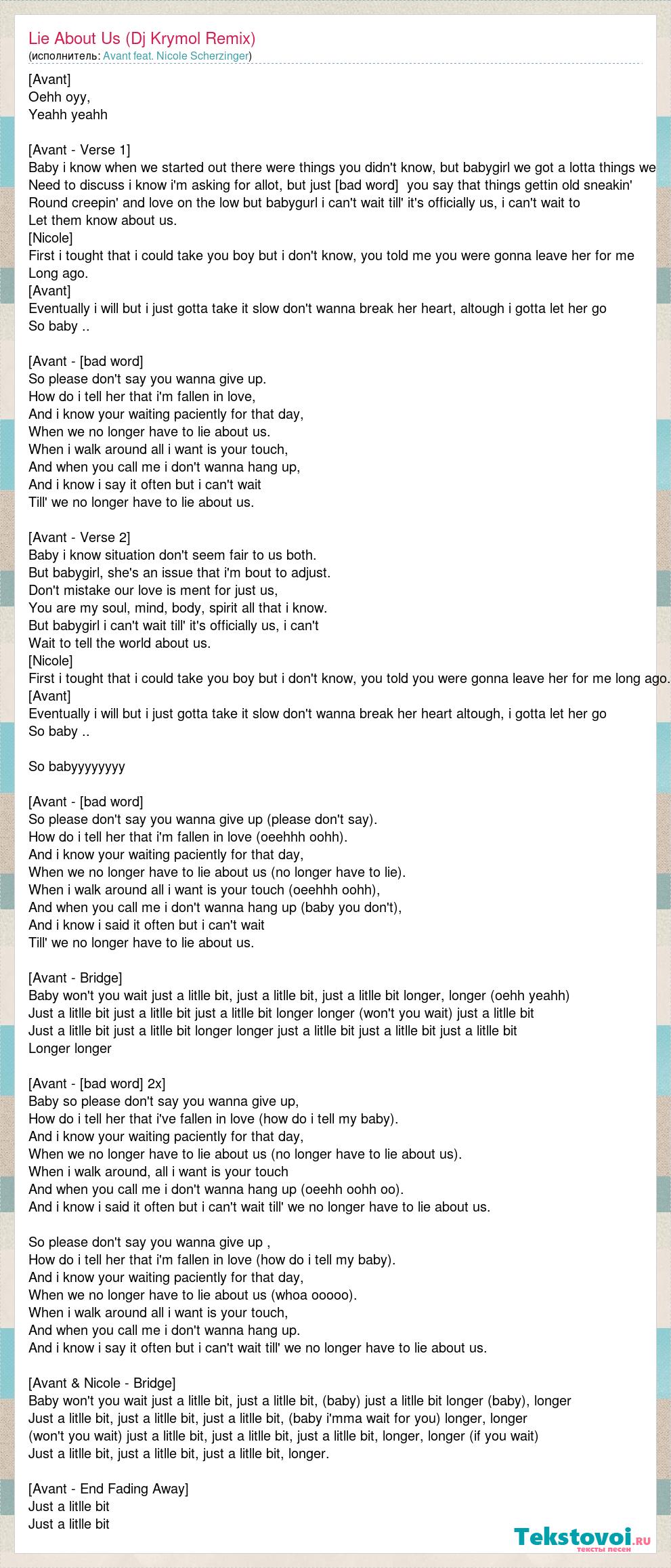 [Avant] Oehh oyy, Yeahh yeahh [Avant - Verse 1] Baby i know when we started out there were things you didn't know, but babygirl we got a lotta things we Need to discuss i know i'm asking for allot, but just [bad word] you say that things gettin old sneakin' Round creepin' and love on the low but babygurl i can't wait till' it's officially us, i can't wait to Let them know about us. [Nicole] First i tought that i could take you boy but i don't know, you told me you were gonna leave her for me Long ago. [Avant] Eventually i will but i just gotta take it slow don't wanna break her heart, altough i gotta let her go So baby .. [Avant - [bad word] So please don't say you wanna give up. How do i tell her that i'm fallen in love, And i know your waiting paciently for that day, When we no longer have to lie about us. When i walk around all i want is your touch, And when you call me i don't wanna hang up, And i know i say it often but i can't wait Till' we no longer have to lie about us. [Avant - Verse 2] Baby i know situation don't seem fair to us both. But babygirl, she's an issue that i'm bout to adjust. Don't mistake our love is ment for just us, You are my soul, mind, body, spirit all that i know. But babygirl i can't wait till' it's officially us, i can't Wait to tell the world about us. [Nicole] First i tought that i could take you boy but i don't know, you told you were gonna leave her for me long ago. [Avant] Eventually i will but i just gotta take it slow don't wanna break her heart altough, i gotta let her go So baby .. So babyyyyyyyy [Avant - [bad word] So please don't say you wanna give up (please don't say). How do i tell her that i'm fallen in love (oeehhh oohh). And i know your waiting paciently for that day, When we no longer have to lie about us (no longer have to lie). When i walk around all i want is your touch (oeehhh oohh), And when you call me i don't wanna hang up (baby you don't), And i know i said it often but i can't wait Till' we no longer have to lie about us. [Avant - Bridge] Baby won't you wait just a litlle bit, just a litlle bit, just a litlle bit longer, longer (oehh yeahh) Just a litlle bit just a litlle bit just a litlle bit longer longer (won't you wait) just a litlle bit Just a litlle bit just a litlle bit longer longer just a litlle bit just a litlle bit just a litlle bit Longer longer [Avant - [bad word] 2x] Baby so please don't say you wanna give up, How do i tell her that i've fallen in love (how do i tell my baby). And i know your waiting paciently for that day, When we no longer have to lie about us (no longer have to lie about us). When i walk around, all i want is your touch And when you call me i don't wanna hang up (oeehh oohh oo). And i know i said it often but i can't wait till' we no longer have to lie about us. So please don't say you wanna give up , How do i tell her that i'm fallen in love (how do i tell my baby). And i know your waiting paciently for that day, When we no longer have to lie about us (whoa ooooo). When i walk around all i want is your touch, And when you call me i don't wanna hang up. And i know i say it often but i can't wait till' we no longer have to lie about us. [Avant & Nicole - Bridge] Baby won't you wait just a litlle bit, just a litlle bit, (baby) just a litlle bit longer (baby), longer Just a litlle bit, just a litlle bit, just a litlle bit, (baby i'mma wait for you) longer, longer (won't you wait) just a litlle bit, just a litlle bit, just a litlle bit, longer, longer (if you wait) Just a litlle bit, just a litlle bit, just a litlle bit, longer. [Avant - End Fading Away] Just a litlle bit Just a litlle bit