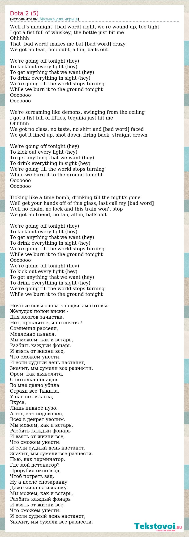 Well it's midnight, [bad word] right, we're wound up, too tight I got a fist full of whiskey, the bottle just bit me Ohhhhh That [bad word] makes me bat [bad word] crazy We got no fear, no doubt, all in, balls out We're going off tonight (hey) To kick out every light (hey) To get anything that we want (hey) To drink everything in sight (hey) We're going till the world stops turning While we burn it to the ground tonight Ooooooo Ooooooo We're screaming like demons, swinging from the ceiling I got a fist full of fifties, tequilia just hit me Ohhhhh We got no class, no taste, no shirt and [bad word] faced We got it lined up, shot down, firing back, straight crown We're going off tonight (hey) To kick out every light (hey) To get anything that we want (hey) To drink everything in sight (hey) We're going till the world stops turning While we burn it to the ground tonight Ooooooo Ooooooo Ticking like a time bomb, drinking till the night's gone Well get your hands off of this glass, last call my [bad word] Well no chain, no lock and this train won't stop We got no friend, no tab, all in, balls out We're going off tonight (hey) To kick out every light (hey) To get anything that we want (hey) To drink everything in sight (hey) We're going till the world stops turning While we burn it to the ground tonight Ooooooo We're going off tonight (hey) To kick out every light (hey) To get anything that we want (hey) To drink everything in sight (hey) We're going till the world stops turning While we burn it to the ground tonight Ночные совы снова к подвигам готовы. Желудок полон виски - Для мозгов зачистка. Нет, проклятье, я не спятил! Сомнения рассеял, Медленно пьянея. Мы можем, как и встарь, Разбить каждый фонарь И взять от жизни все, Что сможем унести. И если судный день настанет, Значит, мы сумели все разнести. Орем, как дьяволята, С потолка попадав. Во мне давно убила Страхи все Тыкила. У нас нет класса, Вкуса, Лишь пивное пузо. А тех, кто недоволен, Всех в декрет уволим. Мы можем, как и встарь, Разбить каждый фонарь И взять от жизни все, Что сможем унести. И если судный день настанет, Значит, мы сумели все разнести. Пью, как терминатор. Где мой детонатор? Прорубил окно в ад, Чтоб погреть зад. Ну а после спозаранку Даже яйца на изнанку. Мы можем, как и встарь, Разбить каждый фонарь И взять от жизни все, Что сможем унести. И если судный день настанет, Значит, мы сумели все разнести.