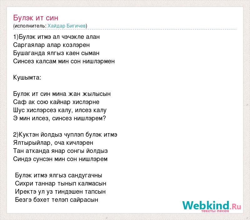 1)Булэк итмэ ал чэчэкле алан Саргаялар алар козлэрен Бушаганда ялгыз каен сыман Синсез калсам мин сон нишлэрмен Кушымта: Булэк ит син мина жан жылысын Саф ак сою кайнар хислэрне Шус хислэрсез калу, илсез калу Э мин илсез, синсез нишлэрем? 2)Куктэн йолдыз чуплэп булэк итмэ Ялтырыйлар, оча кичлэрен Тан атканда янар сонгы йолдыз Синдэ сунсэн мин сон нишлэрем Булэк итмэ ялгыз сандугачны Сихри таннар тынып калмасын Иректэ ул уз тиндэшен тапсын Безгэ бэхет телэп сайрасын