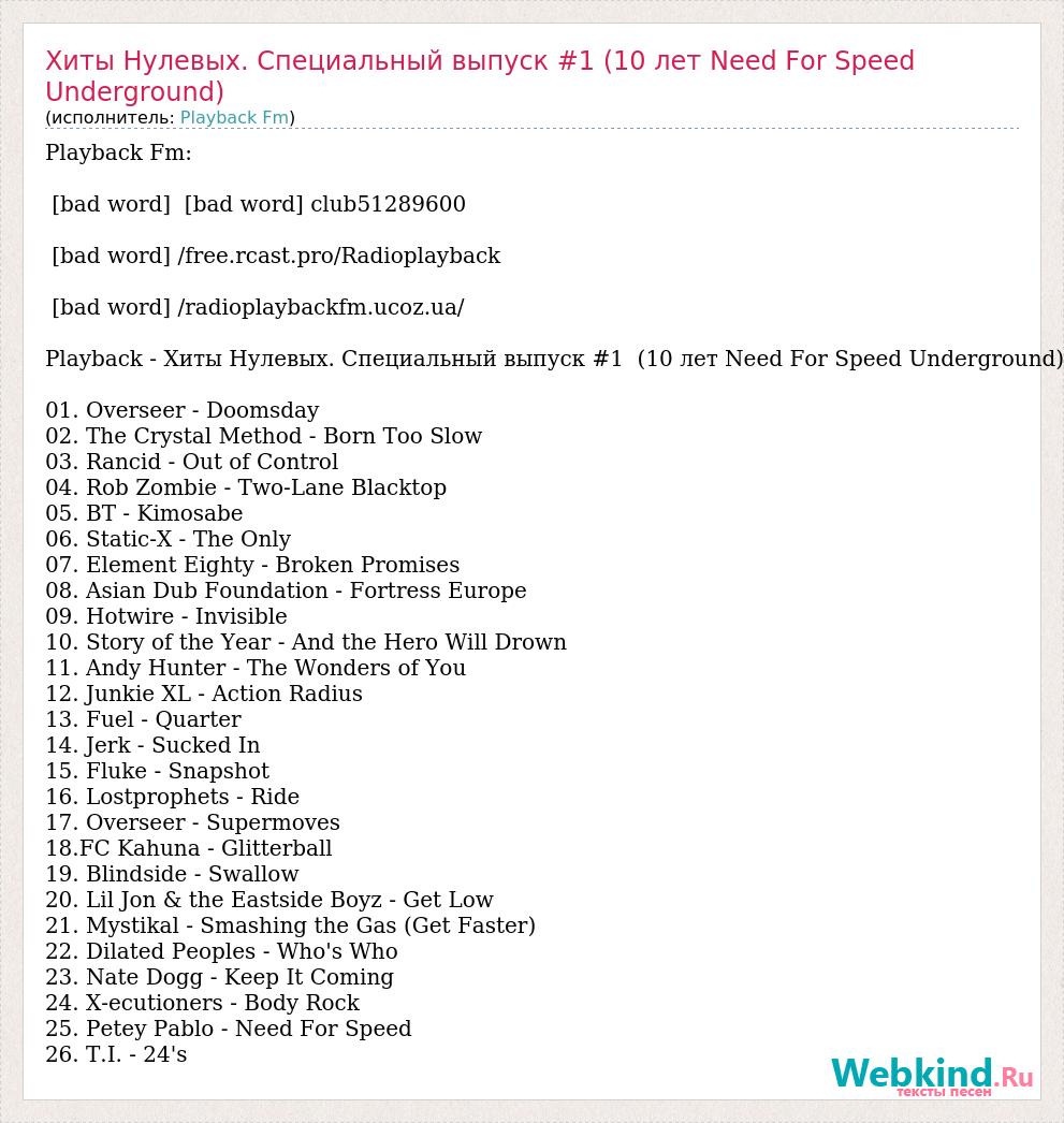 Playback Fm: [bad word] [bad word] club51289600 [bad word] /free.rcast.pro/Radioplayback [bad word] /radioplaybackfm.ucoz.ua/ Playback - Хиты Нулевых. Специальный выпуск #1 (10 лет Need For Speed Underground) 01. Overseer - Doomsday 02. The Crystal Method - Born Too Slow 03. Rancid - Out of Control 04. Rob Zombie - Two-Lane Blacktop 05. BT - Kimosabe 06. Static-X - The Only 07. Element Eighty - Broken Promises 08. Asian Dub Foundation - Fortress Europe 09. Hotwire - Invisible 10. Story of the Year - And the Hero Will Drown 11. Andy Hunter - The Wonders of You 12. Junkie XL - Action Radius 13. Fuel - Quarter 14. Jerk - Sucked In 15. Fluke - Snapshot 16. Lostprophets - Ride 17. Overseer - Supermoves 18.FC Kahuna - Glitterball 19. Blindside - Swallow 20. Lil Jon & the Eastside Boyz - Get Low 21. Mystikal - Smashing the Gas (Get Faster) 22. Dilated Peoples - Who's Who 23. Nate Dogg - Keep It Coming 24. X-ecutioners - Body Rock 25. Petey Pablo - Need For Speed 26. T.I. - 24's