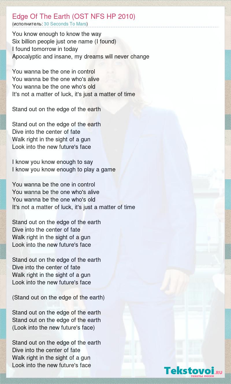 You know enough to know the way Six billion people just one name (I found) I found tomorrow in today Apocalyptic and insane, my dreams will never change You wanna be the one in control You wanna be the one who's alive You wanna be the one who's old It's not a matter of luck, it's just a matter of time Stand out on the edge of the earth Stand out on the edge of the earth Dive into the center of fate Walk right in the sight of a gun Look into the new future's face I know you know enough to say I know you know enough to play a game You wanna be the one in control You wanna be the one who's alive You wanna be the one who's old It's not a matter of luck, it's just a matter of time Stand out on the edge of the earth Dive into the center of fate Walk right in the sight of a gun Look into the new future's face Stand out on the edge of the earth Dive into the center of fate Walk right in the sight of a gun Look into the new future's face (Stand out on the edge of the earth) Stand out on the edge of the earth Stand out on the edge of the earth (Look into the new future's face) Stand out on the edge of the earth Dive into the center of fate Walk right in the sight of a gun Look into the new future's face