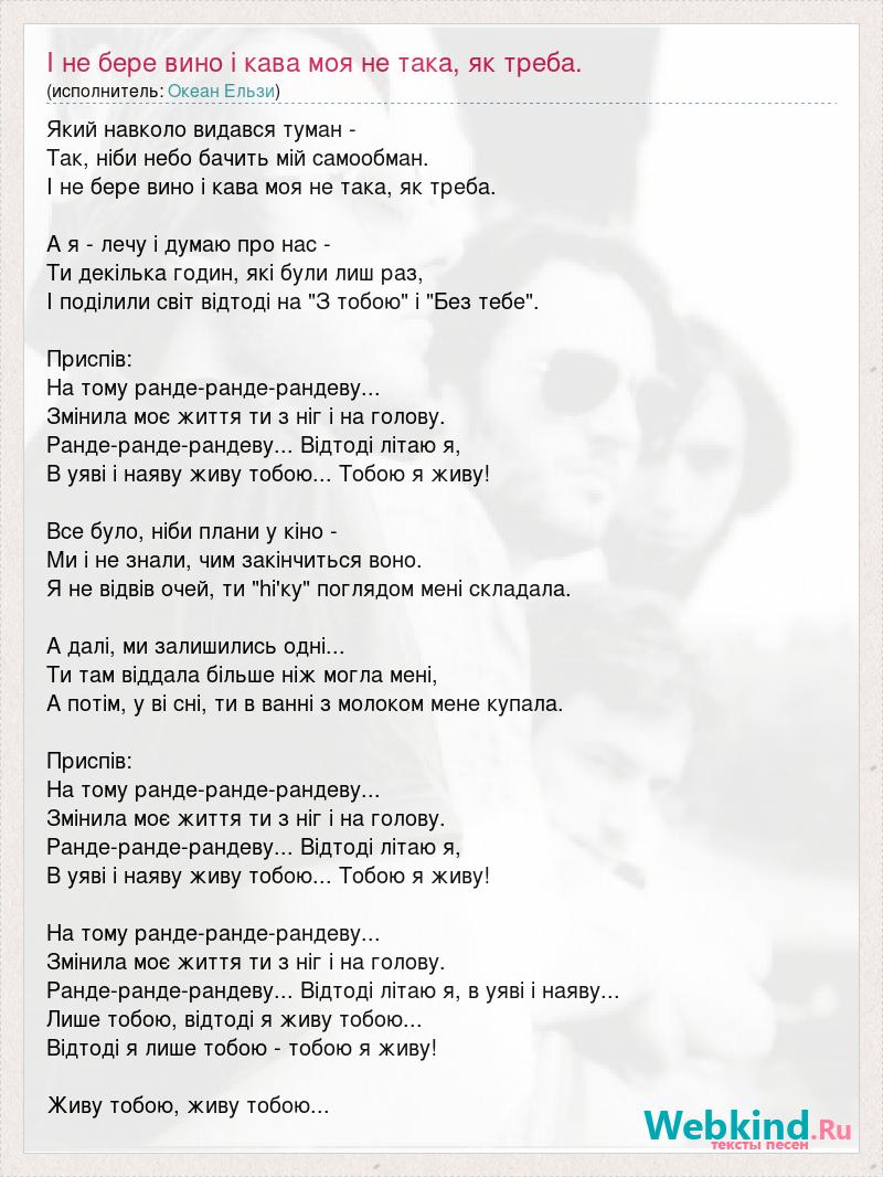 Який навколо видався туман - Так, ніби небо бачить мій самообман. І не бере вино і кава моя не така, як треба. А я - лечу і думаю про нас - Ти декілька годин, які були лиш раз, І поділили світ відтоді на "З тобою" i "Без тебе". Приспів: На тому ранде-ранде-рандеву... Змінила моє життя ти з ніг і на голову. Ранде-ранде-рандеву... Відтоді літаю я, В уяві і наяву живу тобою... Тобою я живу! Все було, ніби плани у кіно - Ми і не знали, чим закінчиться воно. Я не відвів очей, ти "hi'ку" поглядом мені складала. А далі, ми залишились одні... Ти там віддала більше ніж могла мені, А потім, у ві сні, ти в ванні з молоком мене купала. Приспів: На тому ранде-ранде-рандеву... Змінила моє життя ти з ніг і на голову. Ранде-ранде-рандеву... Відтоді літаю я, В уяві і наяву живу тобою... Тобою я живу! На тому ранде-ранде-рандеву... Змінила моє життя ти з ніг і на голову. Ранде-ранде-рандеву... Відтоді літаю я, в уяві і наяву... Лише тобою, відтоді я живу тобою... Відтоді я лише тобою - тобою я живу! Живу тобою, живу тобою...