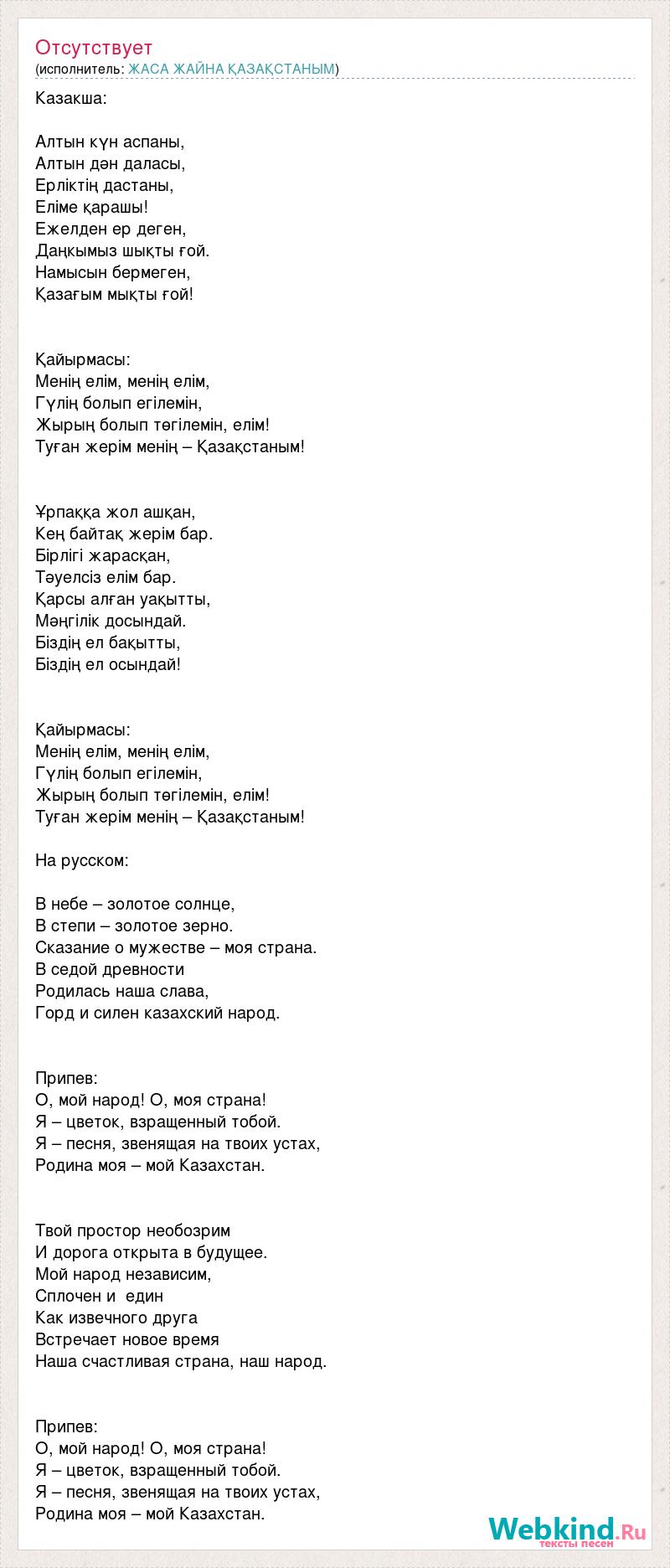 Казакша: Алтын күн аспаны, Алтын дән даласы, Ерліктің дастаны, Еліме қарашы! Ежелден ер деген, Даңкымыз шықты ғой. Намысын бермеген, Қазағым мықты ғой! Қайырмасы: Менің елім, менің елім, Гүлің болып егілемін, Жырың болып төгілемін, елім! Туған жерім менің – Қазақстаным! Ұрпаққа жол ашқан, Кең байтақ жерім бар. Бірлігі жарасқан, Тәуелсіз елім бар. Қарсы алған уақытты, Мәңгілік досындай. Біздің ел бақытты, Біздің ел осындай! Қайырмасы: Менің елім, менің елім, Гүлің болып егілемін, Жырың болып төгілемін, елім! Туған жерім менің – Қазақстаным! На русском: В небе – золотое солнце, В степи – золотое зерно. Сказание о мужестве – моя страна. В седой древности Родилась наша слава, Горд и силен казахский народ. Припев: О, мой народ! О, моя страна! Я – цветок, взращенный тобой. Я – песня, звенящая на твоих устах, Родина моя – мой Казахстан. Твой простор необозрим И дорога открыта в будущее. Мой народ независим, Сплочен и един Как извечного друга Встречает новое время Наша счастливая страна, наш народ. Припев: О, мой народ! О, моя страна! Я – цветок, взращенный тобой. Я – песня, звенящая на твоих устах, Родина моя – мой Казахстан.