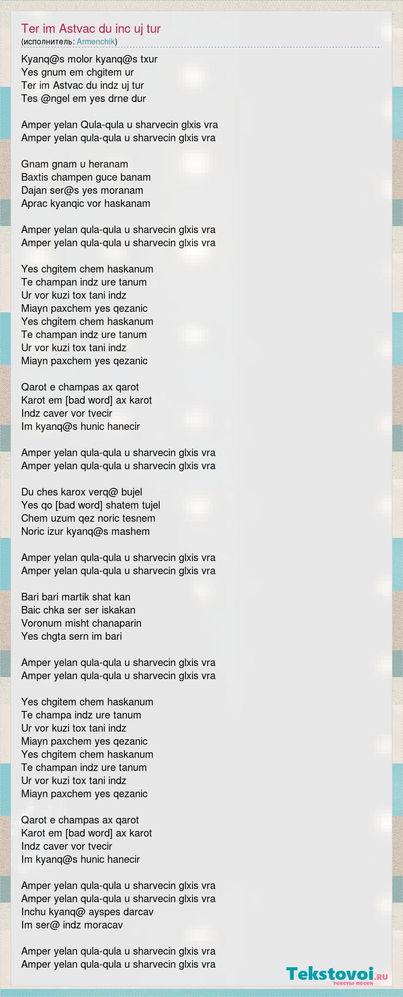 Kyanq@s molor kyanq@s txur Yes gnum em chgitem ur Ter im Astvac du indz uj tur Tes @ngel em yes drne dur Amper yelan Qula-qula u sharvecin glxis vra Amper yelan qula-qula u sharvecin glxis vra Gnam gnam u heranam Baxtis champen guce banam Dajan ser@s yes moranam Aprac kyanqic vor haskanam Amper yelan qula-qula u sharvecin glxis vra Amper yelan qula-qula u sharvecin glxis vra Yes chgitem chem haskanum Te champan indz ure tanum Ur vor kuzi tox tani indz Miayn paxchem yes qezanic Yes chgitem chem haskanum Te champan indz ure tanum Ur vor kuzi tox tani indz Miayn paxchem yes qezanic Qarot e champas ax qarot Karot em sirut ax karot Indz caver vor tvecir Im kyanq@s hunic hanecir Amper yelan qula-qula u sharvecin glxis vra Amper yelan qula-qula u sharvecin glxis vra Du ches karox verq@ bujel Yes qo siruc shatem tujel Chem uzum qez noric tesnem Noric izur kyanq@s mashem Amper yelan qula-qula u sharvecin glxis vra Amper yelan qula-qula u sharvecin glxis vra Bari bari martik shat kan Baic chka ser ser iskakan Voronum misht chanaparin Yes chgta sern im bari Amper yelan qula-qula u sharvecin glxis vra Amper yelan qula-qula u sharvecin glxis vra Yes chgitem chem haskanum Te champa indz ure tanum Ur vor kuzi tox tani indz Miayn paxchem yes qezanic Yes chgitem chem haskanum Te champan indz ure tanum Ur vor kuzi tox tani indz Miayn paxchem yes qezanic Qarot e champas ax qarot Karot em sirut ax karot Indz caver vor tvecir Im kyanq@s hunic hanecir Amper yelan qula-qula u sharvecin glxis vra Amper yelan qula-qula u sharvecin glxis vra Inchu kyanq@ ayspes darcav Im ser@ indz moracav Amper yelan qula-qula u sharvecin glxis vra Amper yelan qula-qula u sharvecin glxis vra