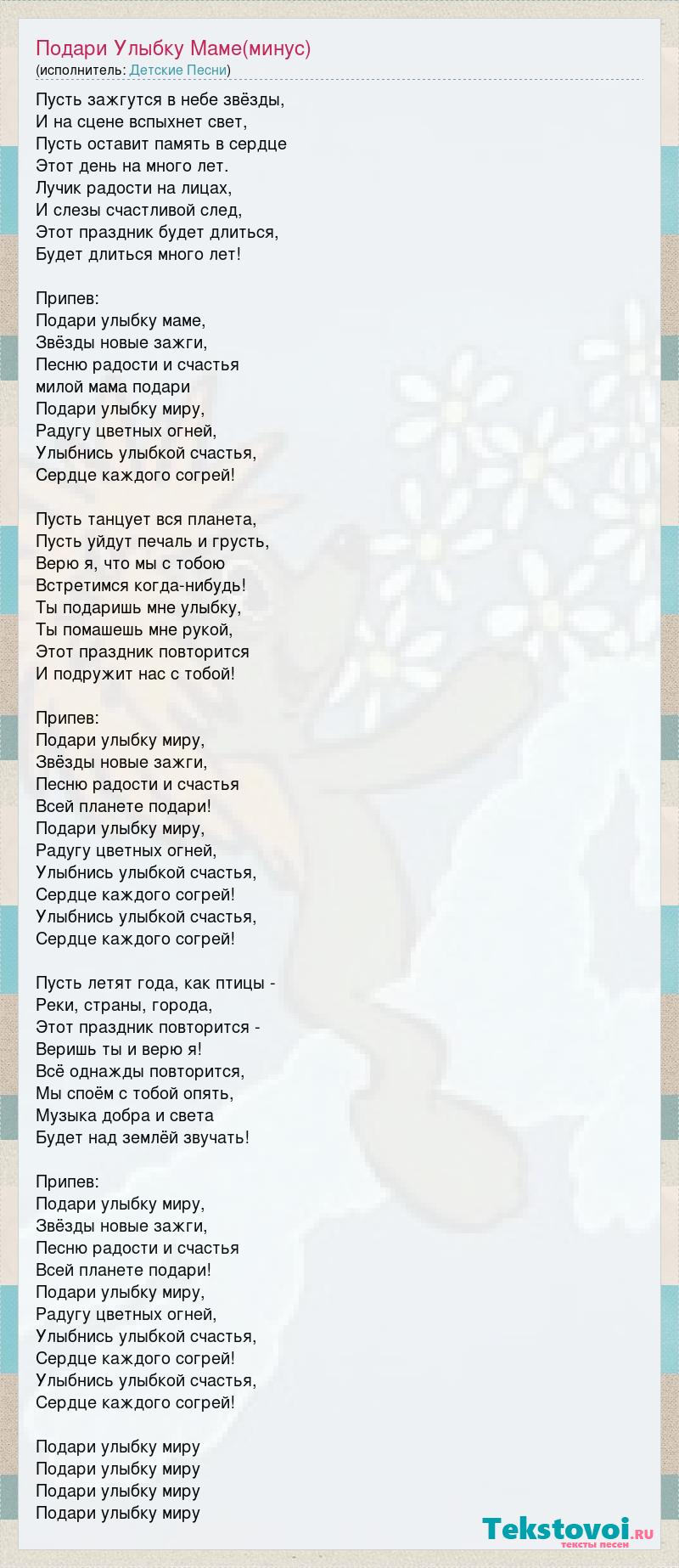 Пусть зажгутся в небе звёзды, И на сцене вспыхнет свет, Пусть оставит память в сердце Этот день на много лет. Лучик радости на лицах, И слезы счастливой след, Этот праздник будет длиться, Будет длиться много лет! Припев: Подари улыбку маме, Звёзды новые зажги, Песню радости и счастья милой мама подари Подари улыбку миру, Радугу цветных огней, Улыбнись улыбкой счастья, Сердце каждого согрей! Пусть танцует вся планета, Пусть уйдут печаль и грусть, Верю я, что мы с тобою Встретимся когда-нибудь! Ты подаришь мне улыбку, Ты помашешь мне рукой, Этот праздник повторится И подружит нас с тобой! Припев: Подари улыбку миру, Звёзды новые зажги, Песню радости и счастья Всей планете подари! Подари улыбку миру, Радугу цветных огней, Улыбнись улыбкой счастья, Сердце каждого согрей! Улыбнись улыбкой счастья, Сердце каждого согрей! Пусть летят года, как птицы - Реки, страны, города, Этот праздник повторится - Веришь ты и верю я! Всё однажды повторится, Мы споём с тобой опять, Музыка добра и света Будет над землёй звучать! Припев: Подари улыбку миру, Звёзды новые зажги, Песню радости и счастья Всей планете подари! Подари улыбку миру, Радугу цветных огней, Улыбнись улыбкой счастья, Сердце каждого согрей! Улыбнись улыбкой счастья, Сердце каждого согрей! Подари улыбку миру Подари улыбку миру Подари улыбку миру Подари улыбку миру