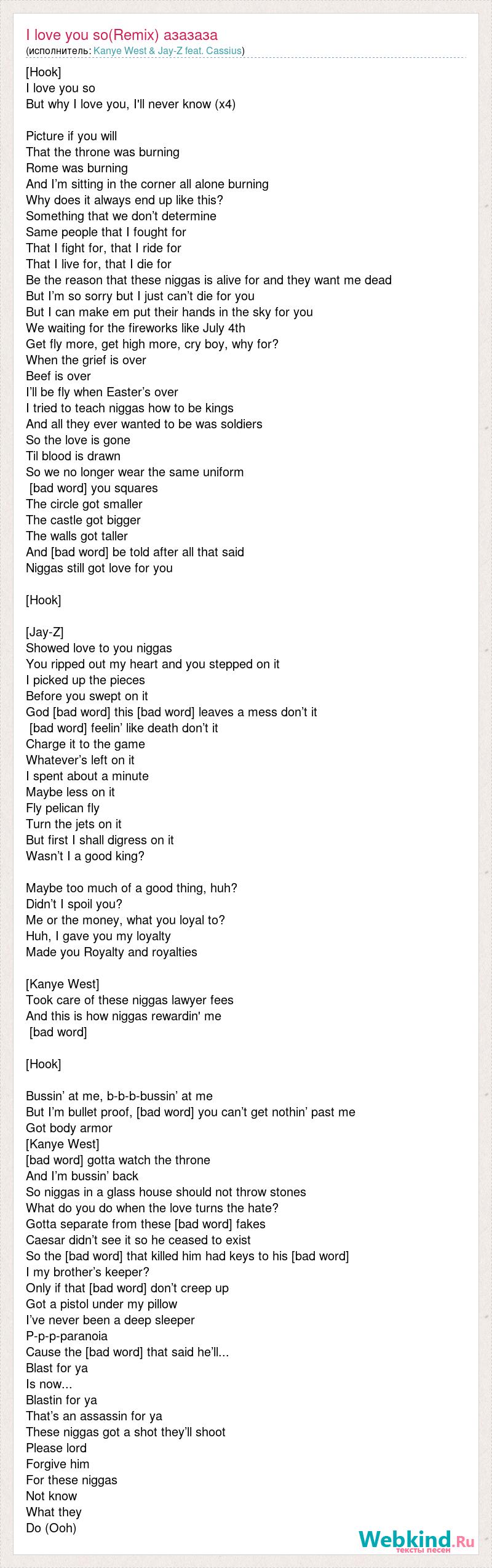 [Hook] I love you so But why I love you, I'll never know (x4) Picture if you will That the throne was burning Rome was burning And I’m sitting in the corner all alone burning Why does it always end up like this? Something that we don’t determine Same people that I fought for That I fight for, that I ride for That I live for, that I die for Be the reason that these niggas is alive for and they want me dead But I’m so sorry but I just can’t die for you But I can make em put their hands in the sky for you We waiting for the fireworks like July 4th Get fly more, get high more, cry boy, why for? When the grief is over Beef is over I’ll be fly when Easter’s over I tried to teach niggas how to be kings And all they ever wanted to be was soldiers So the love is gone Til blood is drawn So we no longer wear the same uniform [bad word] you squares The circle got smaller The castle got bigger The walls got taller And [bad word] be told after all that said Niggas still got love for you [Hook] [Jay-Z] Showed love to you niggas You ripped out my heart and you stepped on it I picked up the pieces Before you swept on it God [bad word] this [bad word] leaves a mess don’t it [bad word] feelin’ like death don’t it Charge it to the game Whatever’s left on it I spent about a minute Maybe less on it Fly pelican fly Turn the jets on it But first I shall digress on it Wasn’t I a good king? Maybe too much of a good thing, huh? Didn’t I spoil you? Me or the money, what you loyal to? Huh, I gave you my loyalty Made you Royalty and royalties [Kanye West] Took care of these niggas lawyer fees And this is how niggas rewardin' me [bad word] [Hook] Bussin’ at me, b-b-b-bussin’ at me But I’m bullet proof, [bad word] you can’t get nothin’ past me Got body armor [Kanye West] [bad word] gotta watch the throne And I’m bussin’ back So niggas in a glass house should not throw stones What do you do when the love turns the hate? Gotta separate from these [bad word] fakes Caesar didn’t see it so he ceased to exist So the [bad word] that killed him had keys to his [bad word] I my brother’s keeper? Only if that [bad word] don’t creep up Got a pistol under my pillow I’ve never been a deep sleeper P-p-p-paranoia Cause the [bad word] that said he’ll... Blast for ya Is now... Blastin for ya That’s an assassin for ya These niggas got a shot they’ll shoot Please lord Forgive him For these niggas Not know What they Do (Ooh)